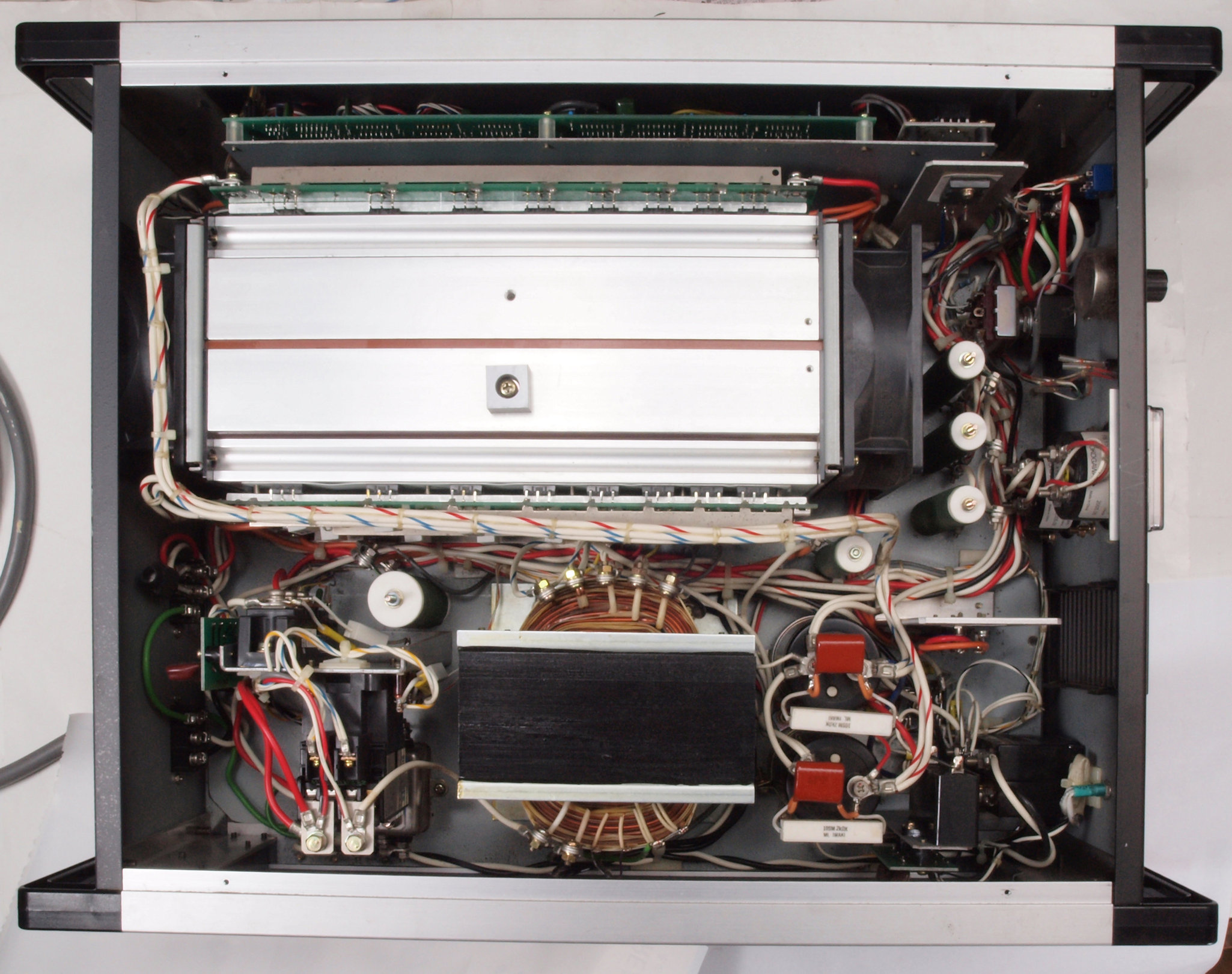 | B5. 上蓋を取り、上から見る。フイルムコンデンサー2個、冷却フアンコントロールサーモ2個追加。 フアンが2個有るので、内側フアン冷却温度、45度=ON、40度=OFF。外側フアン冷却温度、55度=ON、45度=OFF。 |