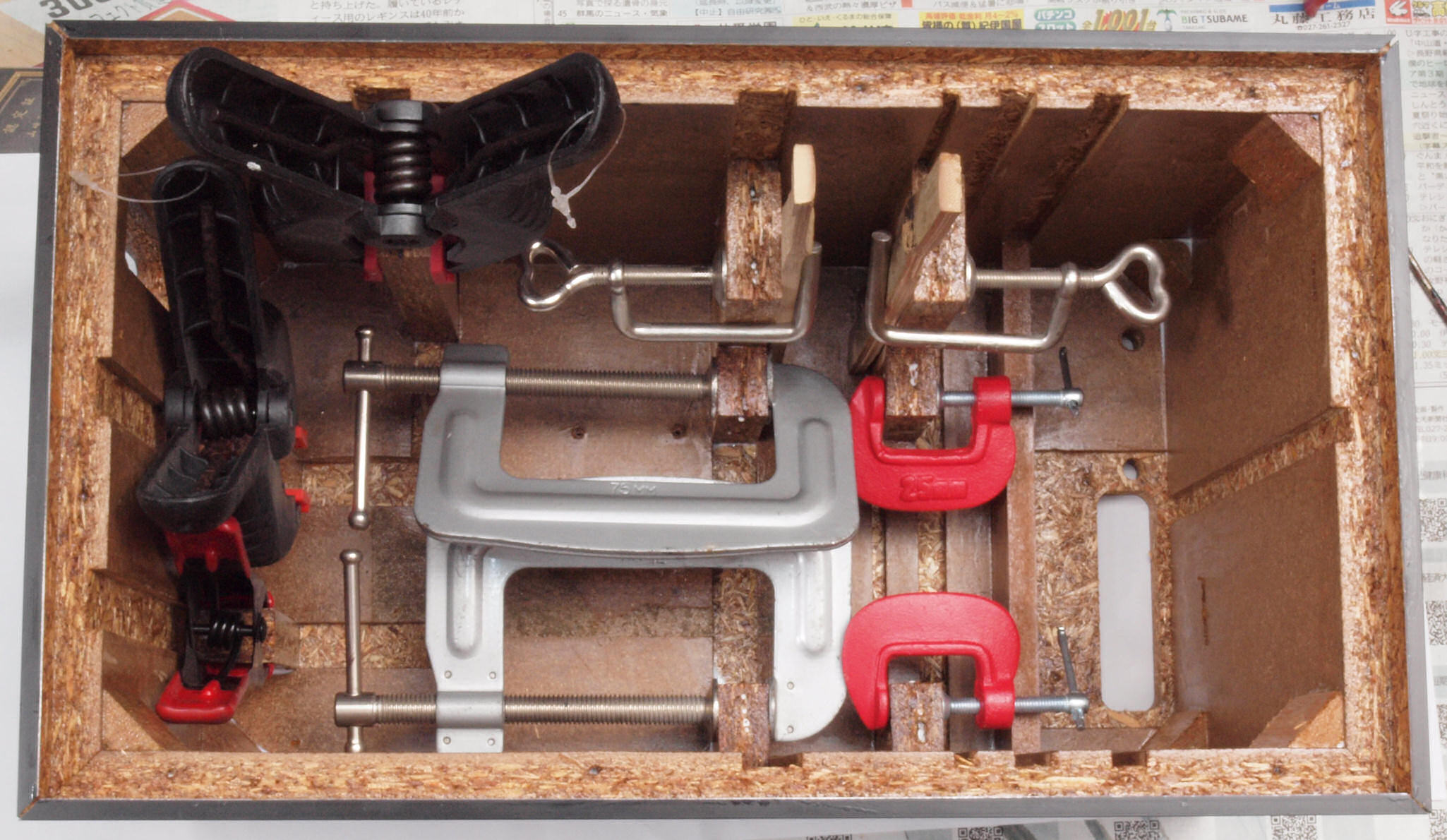C45. 修理中 接着材が劣化した木箱、下前右から見る。圧縮板にボンドを塗って固めている。 | ||||||||||||