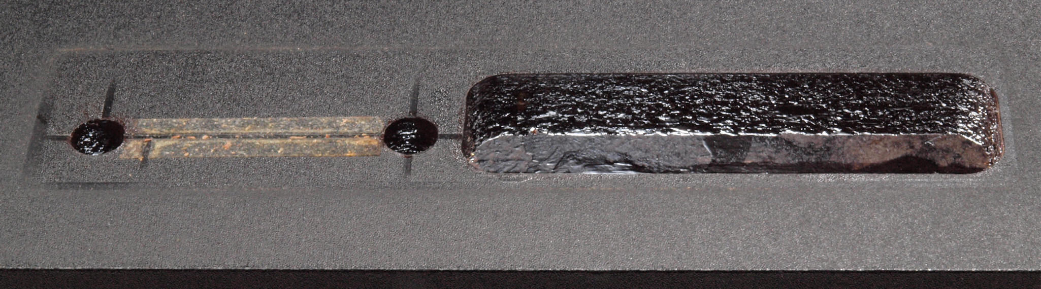 C48. 修理中 接着材が劣化した木箱、下後左から見る。圧縮板にボンドを塗って固めている。