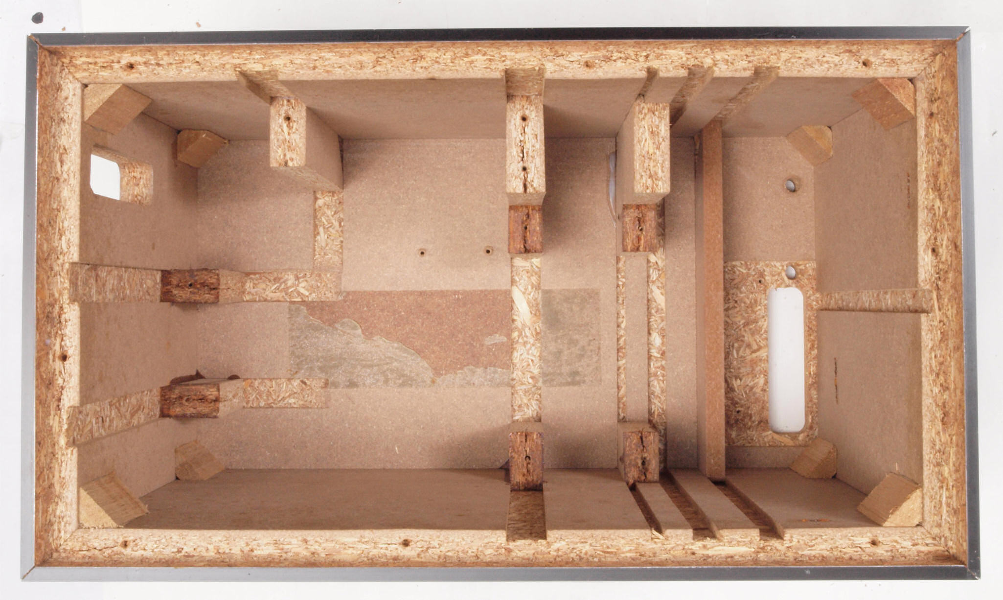 C48. 修理中 接着材が劣化した木箱、下後左から見る。圧縮板にボンドを塗って固めている。 | ||||||||||||