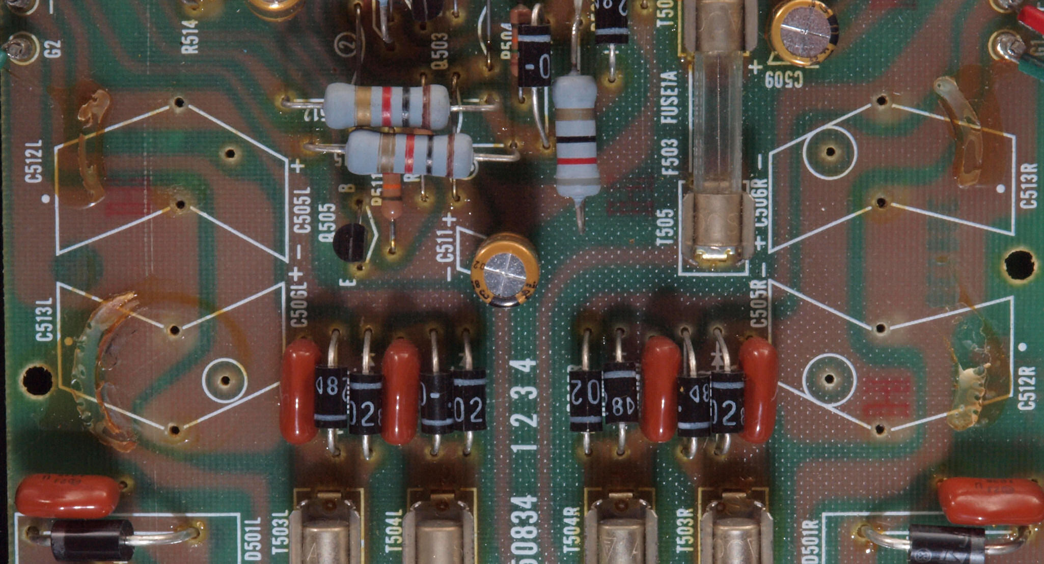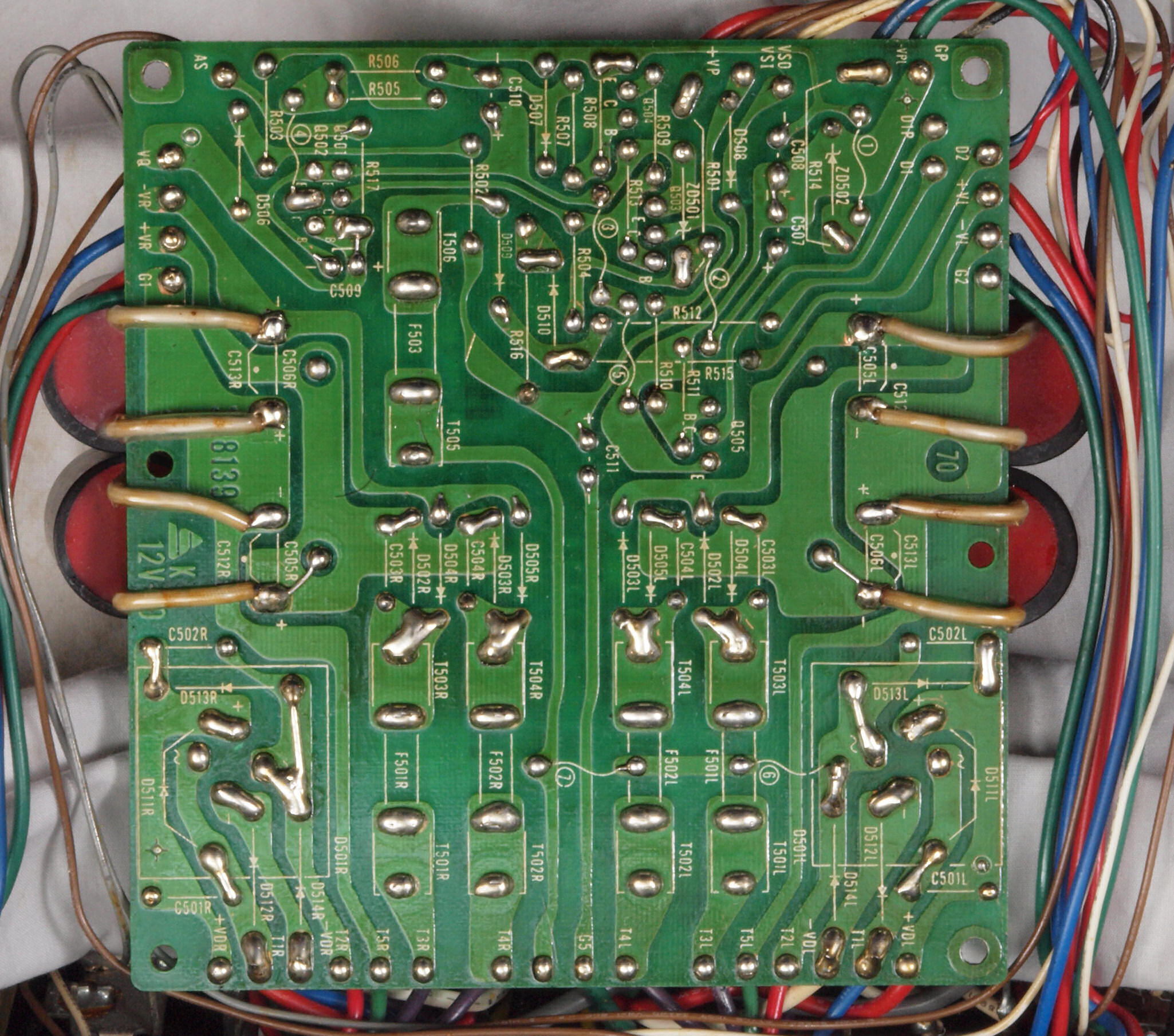 | C43. 修理中 RLモジュール裏。 TR(トランジスター)6個交換し、洗浄後軽くラッカーを吹く。 |