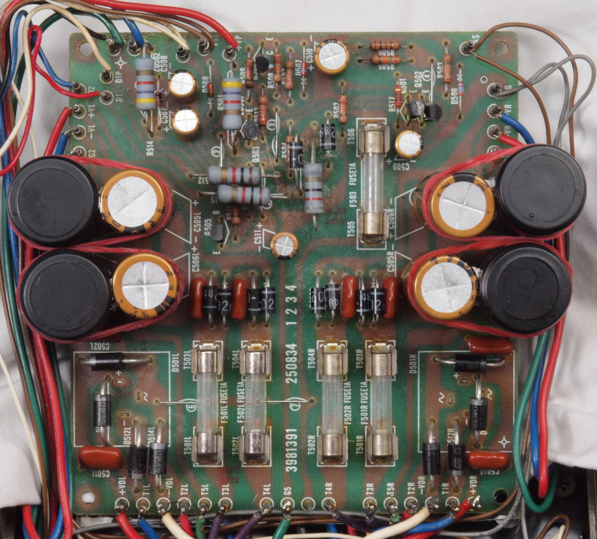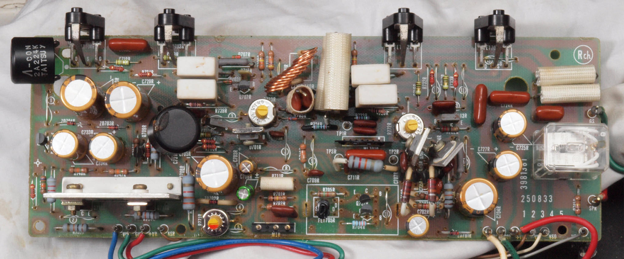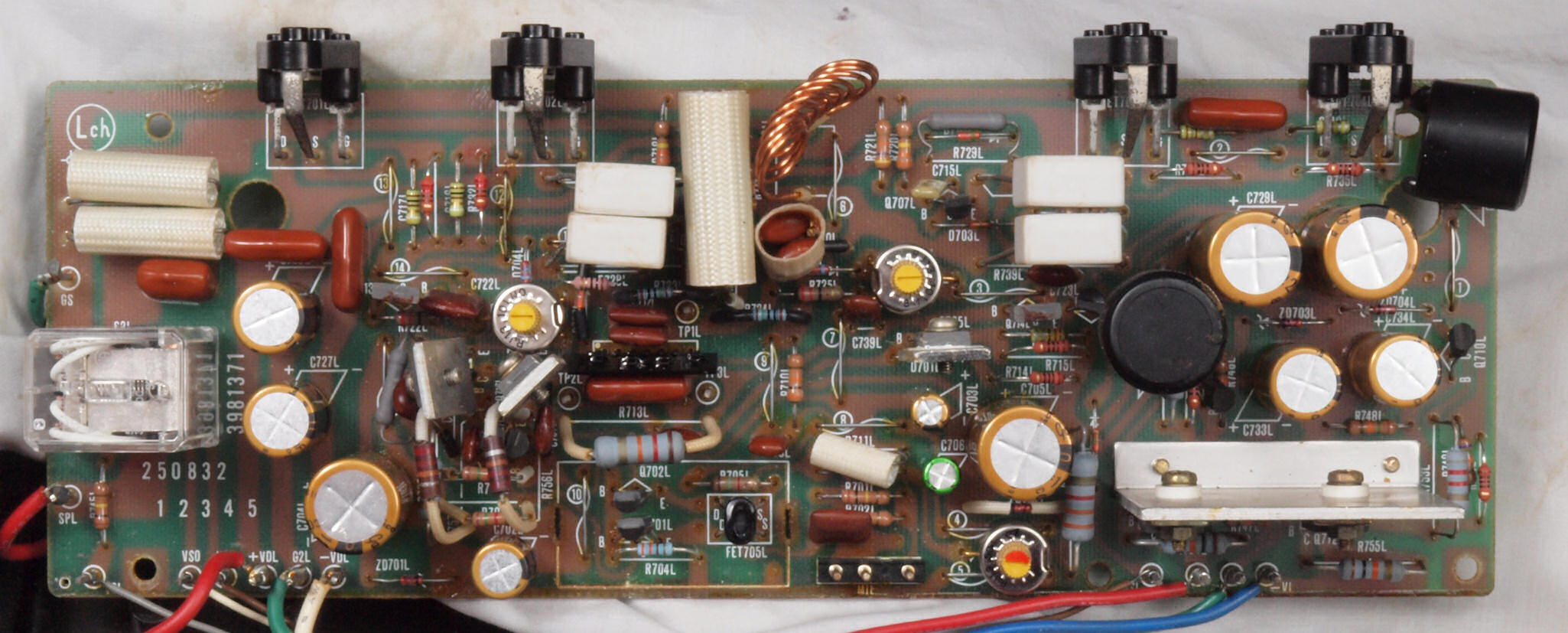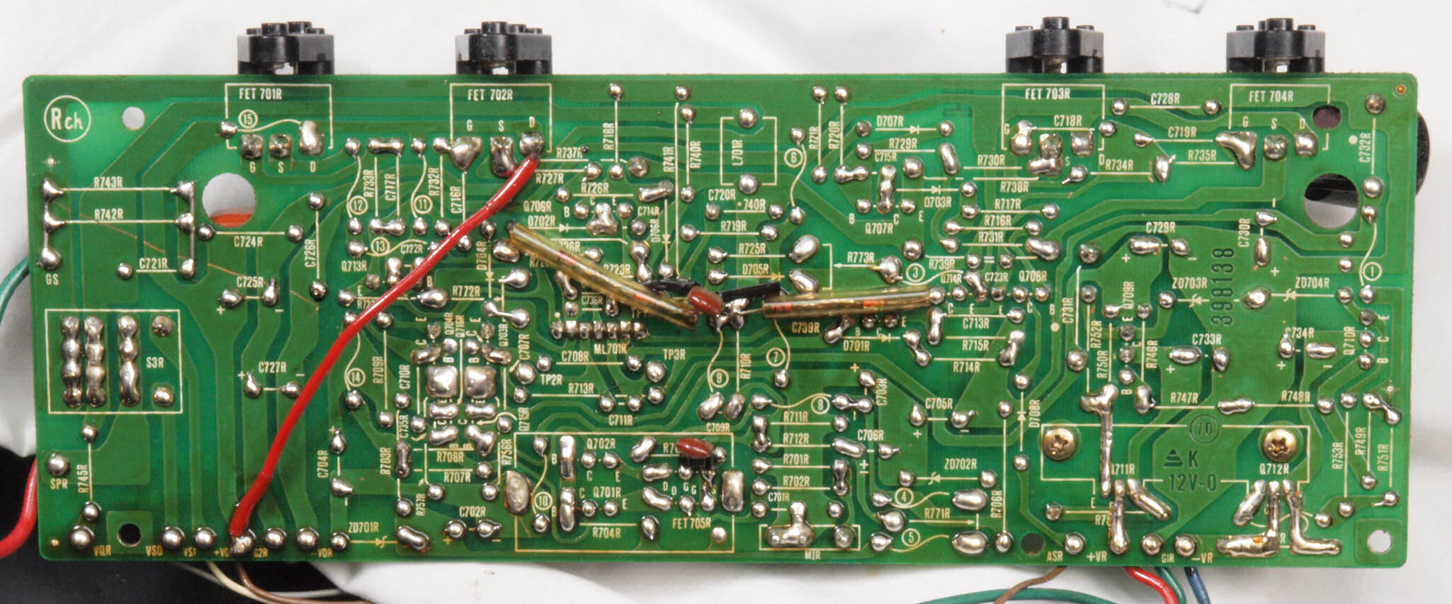 | C12. 修理後 R側ドライブ基板。 初段FET(電界効果トランジスター)、バランス・バイアス調整用半固定VR3個、SP接続リレー交換 ヒューズ入り抵抗全部、電解コンデンサー11個、TR(トランジスター)2個交換、モジュール修理交換部品は除く。 |