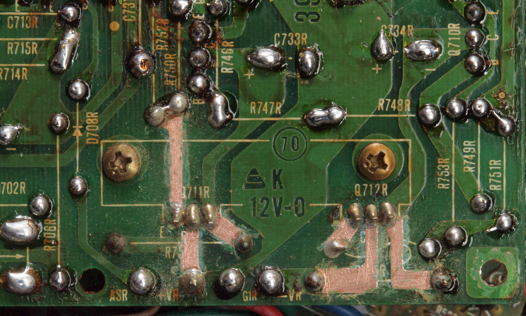 | CC6. 修理後 R側ドライブ基板−電源基板へのラッピング線に半田を浸み込ませる。 |