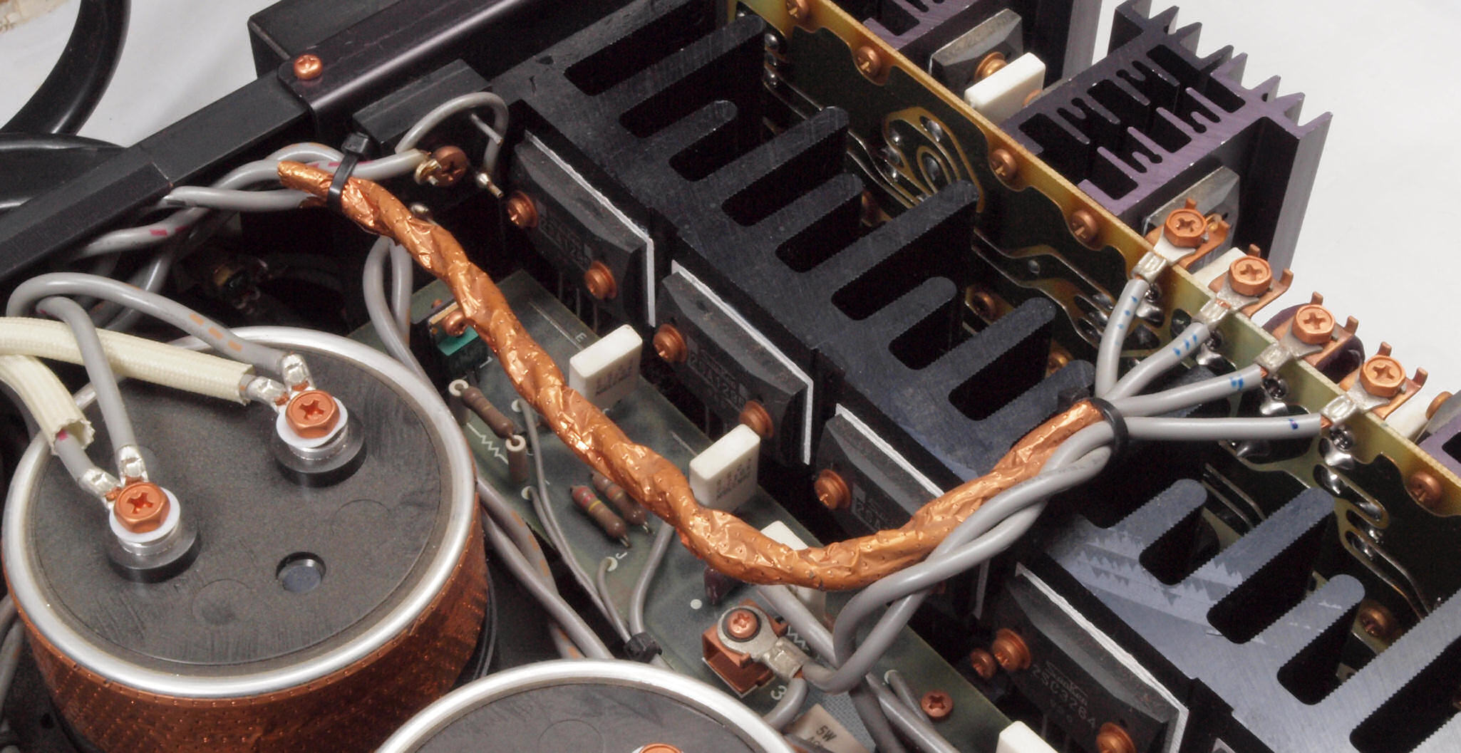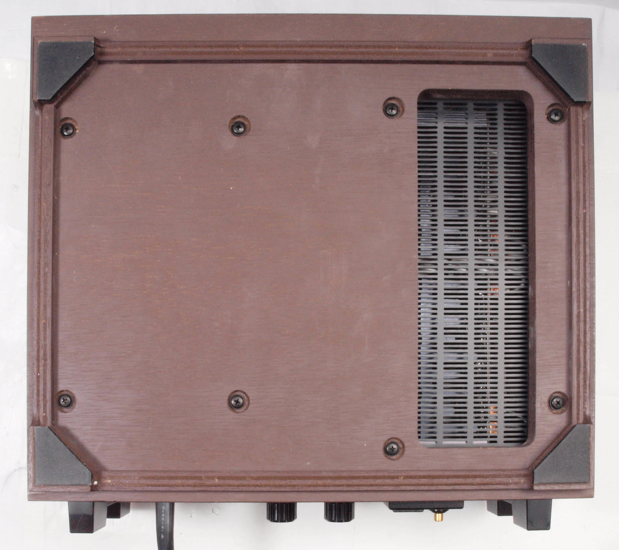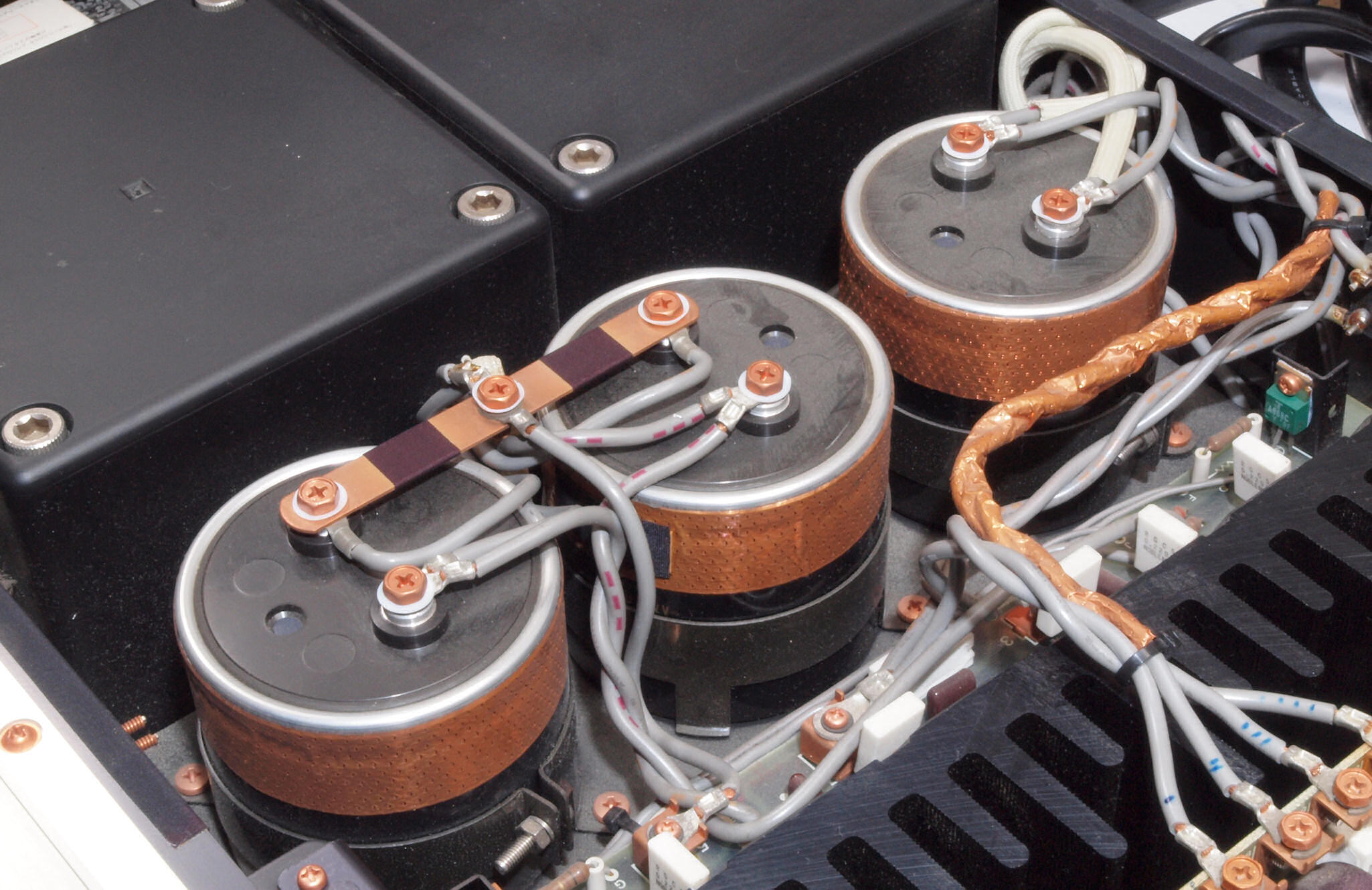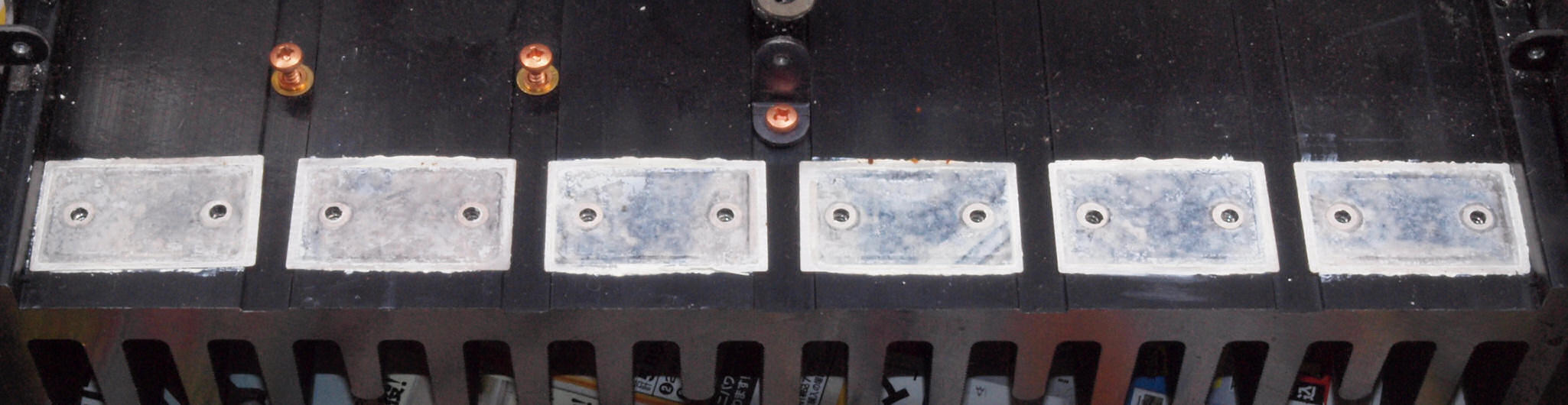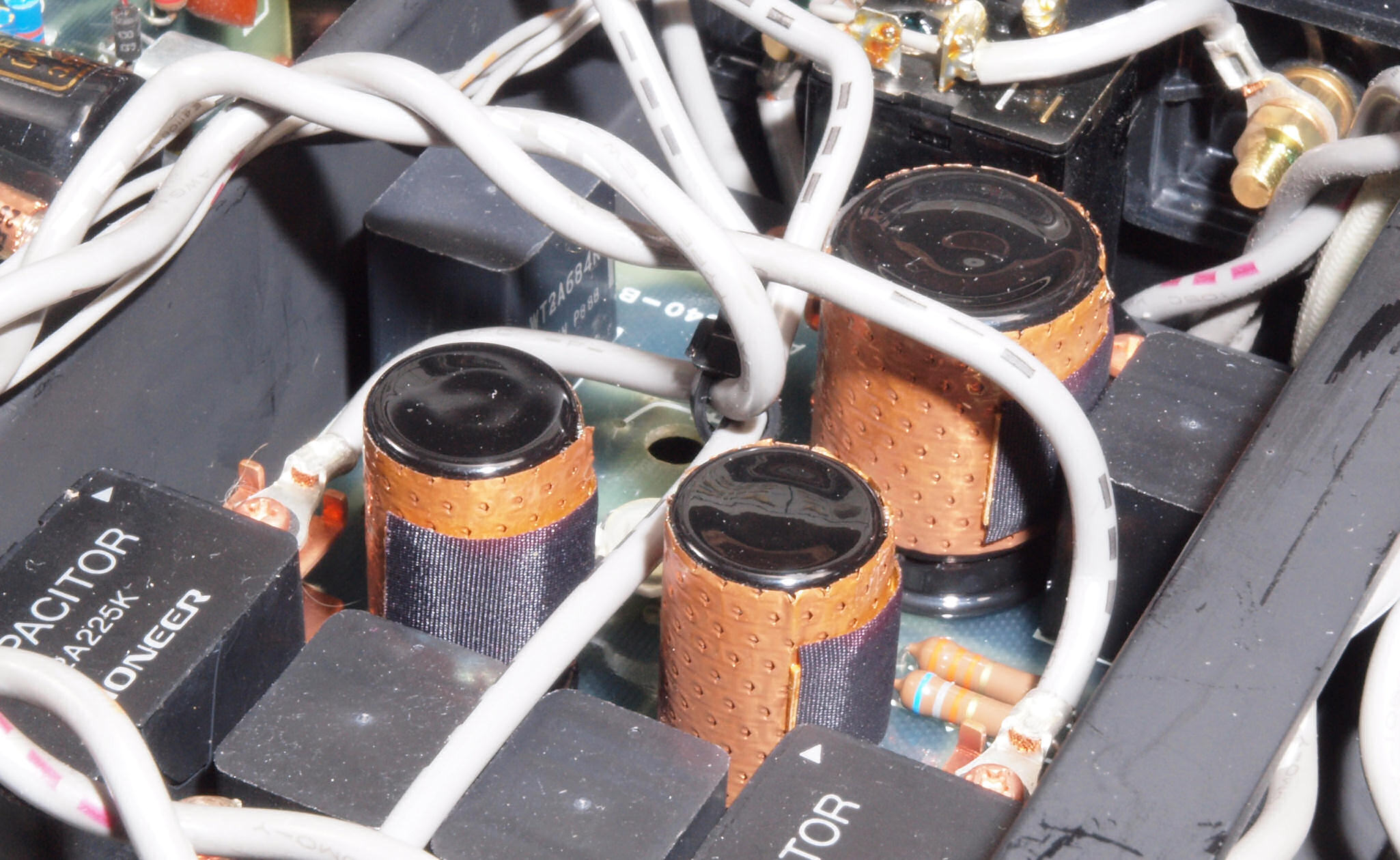 | A32. 点検中 木ケースから取り出し、上から見る。 終段電源ブロック電解コンデンサーに巻いた銅箔テープ。 | ||||||||||||||||||