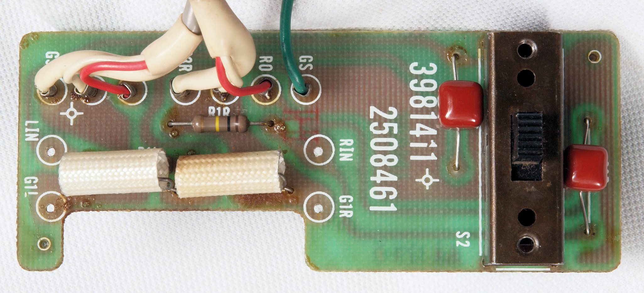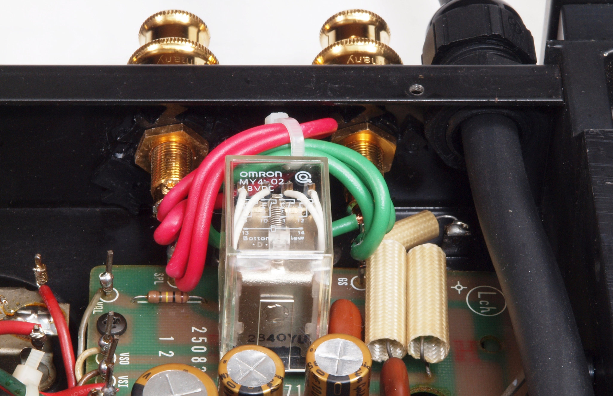 | C72. 修理後 入力RCA端子基板。 フイルムコンデンサー2個交換。 |