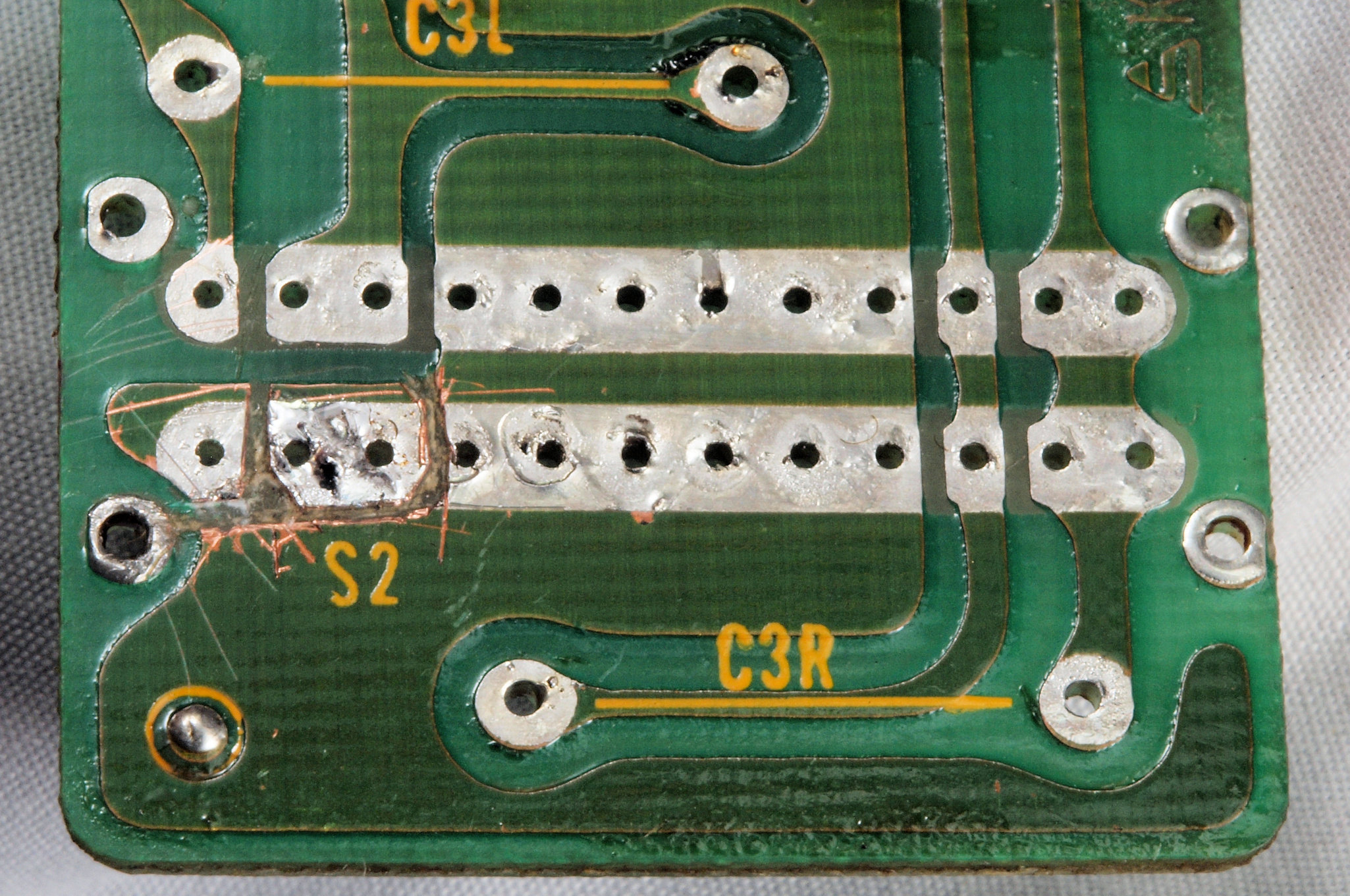 | C15. 修理(半田補正)後 R側ドライブ基板裏 半田を全部やり直す。 普通はこれで完成。 |