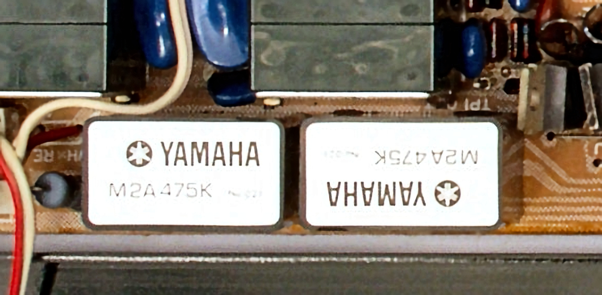 | A2A. 点検中 上下カバー、シールドを取り、下から見る。 トーンアンプ・ヤマハオリジナルの出力のフイルムコンデンサーが電解コンデンサーに交換されている。 | ||||||||||||||||||||||||||||||||||||||||||||||