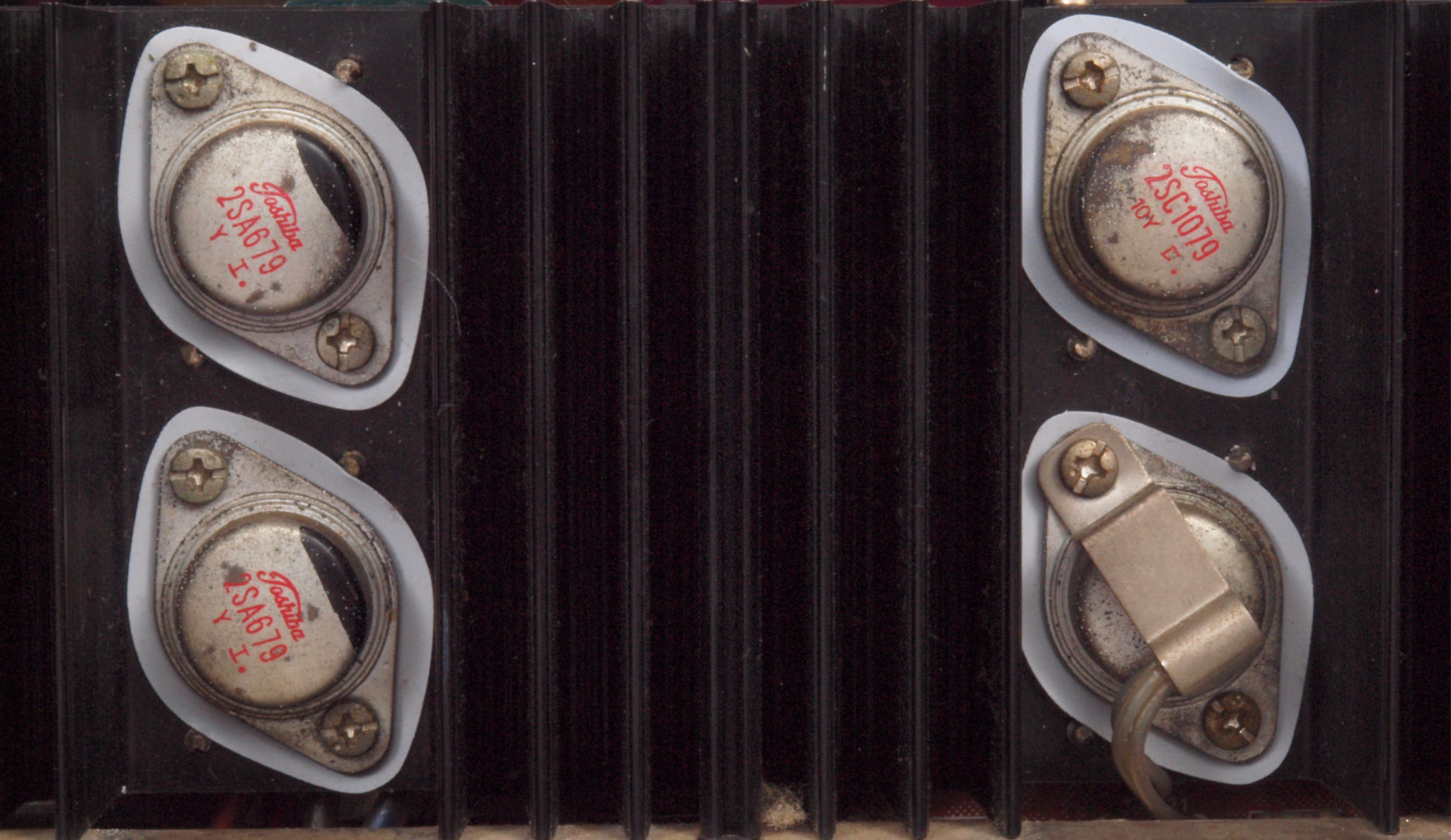 C12. 修理中 R側 終段トランジスター。 熱でシリコングリスが流れ出し殆ど無い、テフロンシートに交換する。
