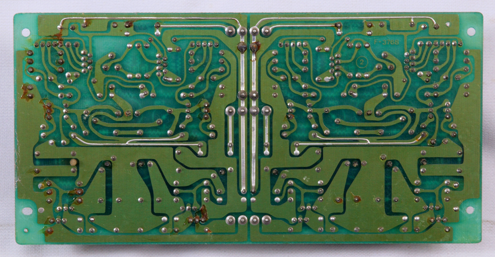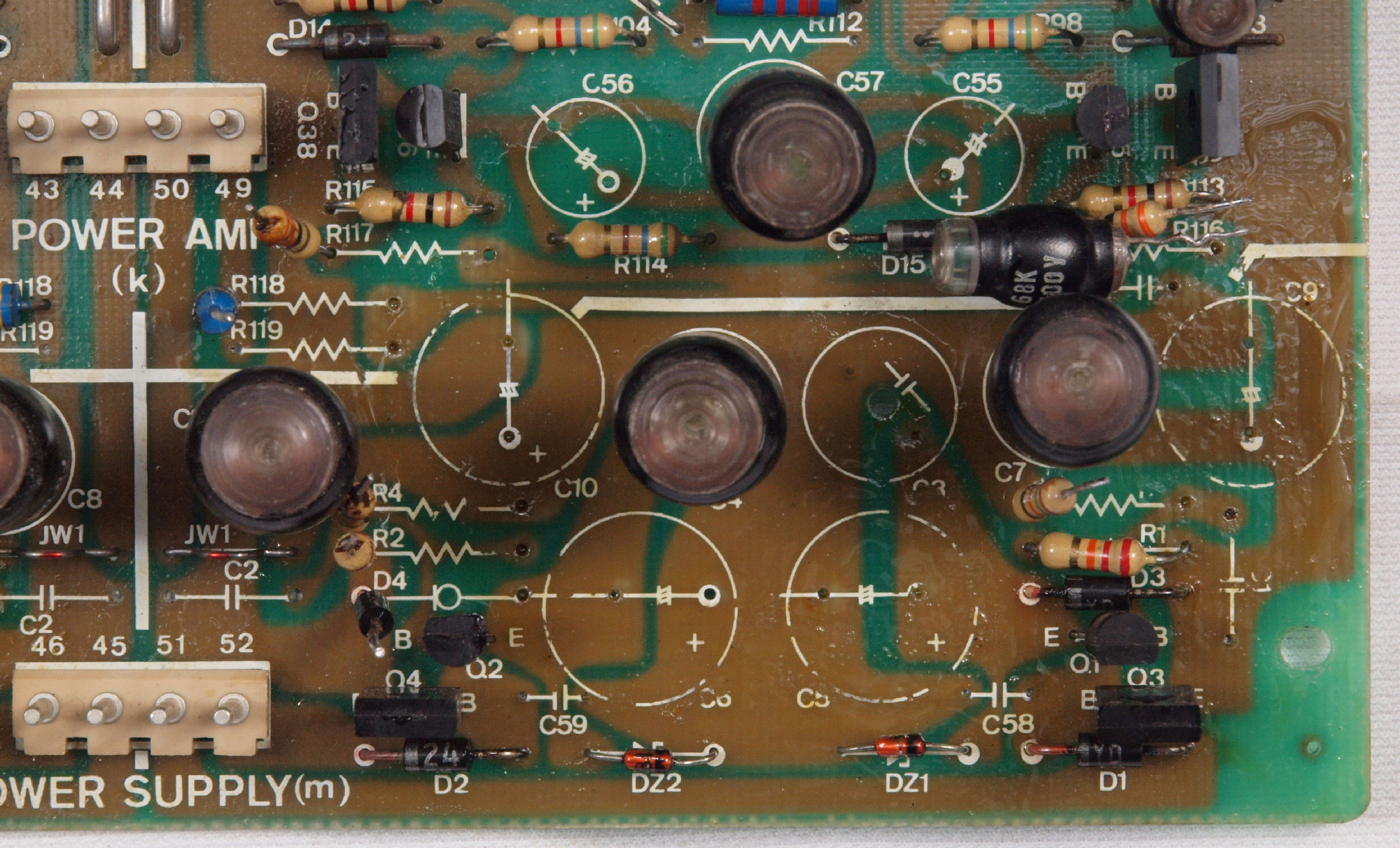| C132. 修理中 R側AMP基板、電解コンデンサー固定用の接着材、当時は溶媒にトルエンが使用されており、銅を腐食する。 | ||||||||||||||||||||||||||||||