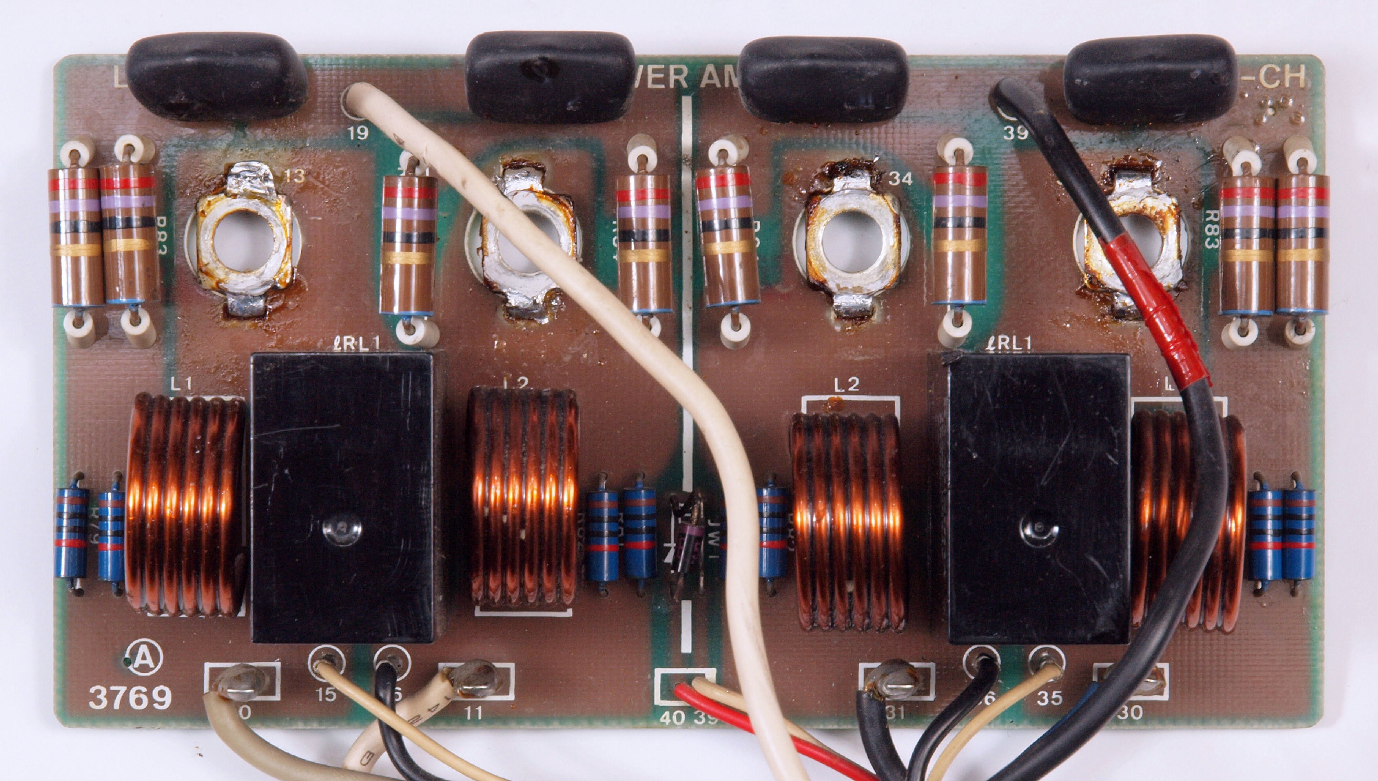 | C134. 修理中 R側AMP基板、電解コンデンサー固定用の接着材2、当時は溶媒にトルエンが使用されており、銅を腐食する。 | ||||||||||||||||||||||||||||||