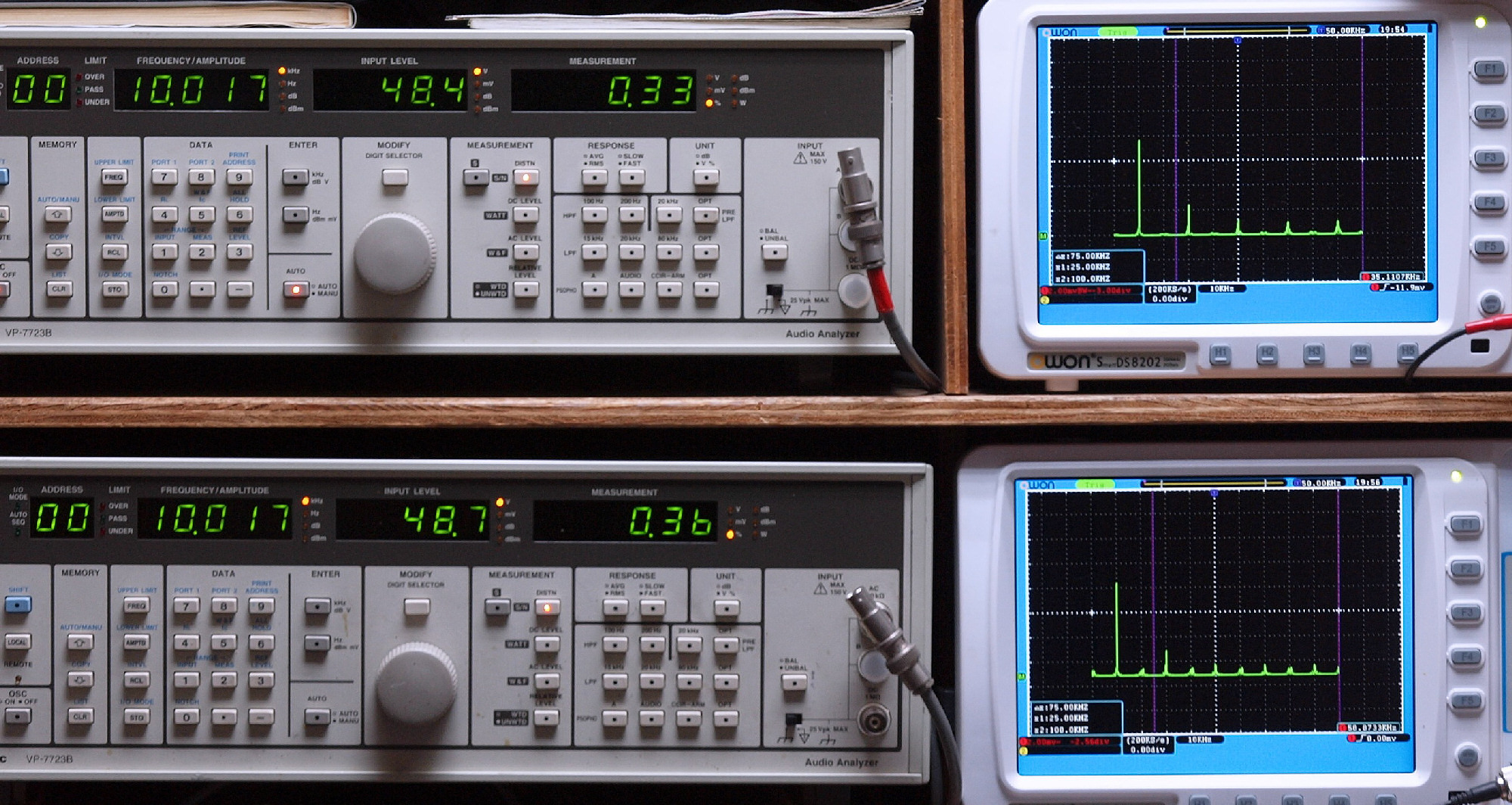 | E. 測定・調整。 画像をクリックすると、大きく(横幅2050ドット)表示されます E1. 出力・歪み率測定・調整 「見方」。 上段中 右側SP出力を「Audio Analyzer Panasonic VP−7723B」により測定。 表示LED、 左端=メモリーNo、 中左=周波数測定、 中右=出力電圧測定、 右端=歪み率測定。 上段右端 VP−7723Bの基本波除去出力を「owon SDS8202(200MHZ)」で「FFT分析」表示。 下段中 左側SP出力を「Audio Analyzer Panasonic VP−7723B」により測定。 表示LED、 左端=メモリーNo、 中左=周波数測定、 中右=出力電圧測定、 右端=歪み率測定。 下段右端 VP−7723Bの基本波除去出力を「owon SDS6062(200MHZ)」で「FFT分析」表示。 下段左端 オーディオ発振器 VP−7201A より50Hz〜100kHzの信号を出し(歪み率=約0.003%)、ATT+分配器を通し、AMPに入力。 よって、ダイアル設定出力レベルより低くなります。測定機器の仕様や整備の様子はこちら、「VP−7723B」「VP−7201A」。 FFT画面の見方はこちら。 |