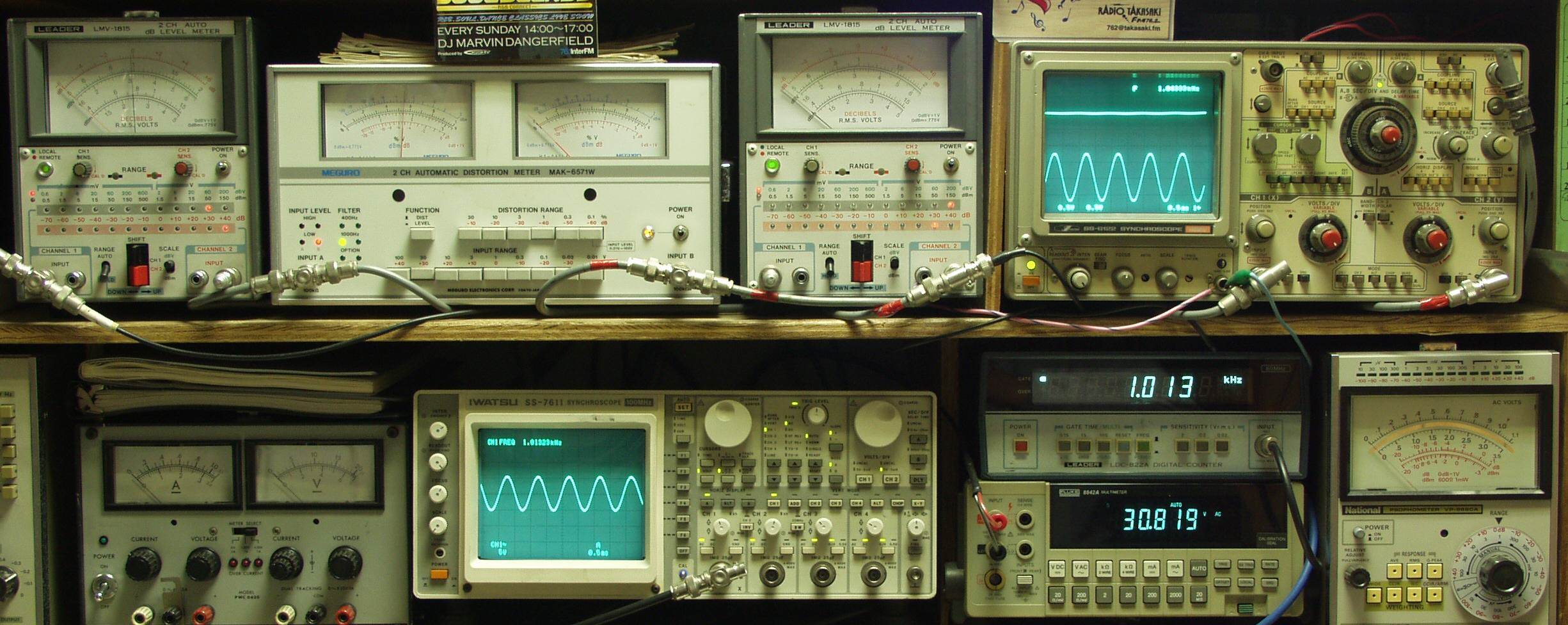 | T. 修理前・測定 T1. 出力/歪み率測定・調整 <見方> 下段左端 オーディオ発振器より400HZ・1KHZの信号を出し(歪み率=約0.003%)これをAMPに入力し、出力を測定 下段中左 オシロ=入力波形(オーディオ発振器のTTLレベル) 下段中右上=周波数計 上段左端 電圧計=L側出力電圧測定、黒針のみ使用 上段中左 歪み率計=出力の歪み率測定 左メータ=L出力、右メータ=R出力 上段中右 電圧計=R側出力電圧測定、赤針のみ使用 上段右端 オシロ=出力波形 上=R出力、下=L出力(実際にはRL電圧計の出力「Max=1V」を観測) 下段中右上 デジタル電圧計=出力電圧測定RLは切り替えて測定 |