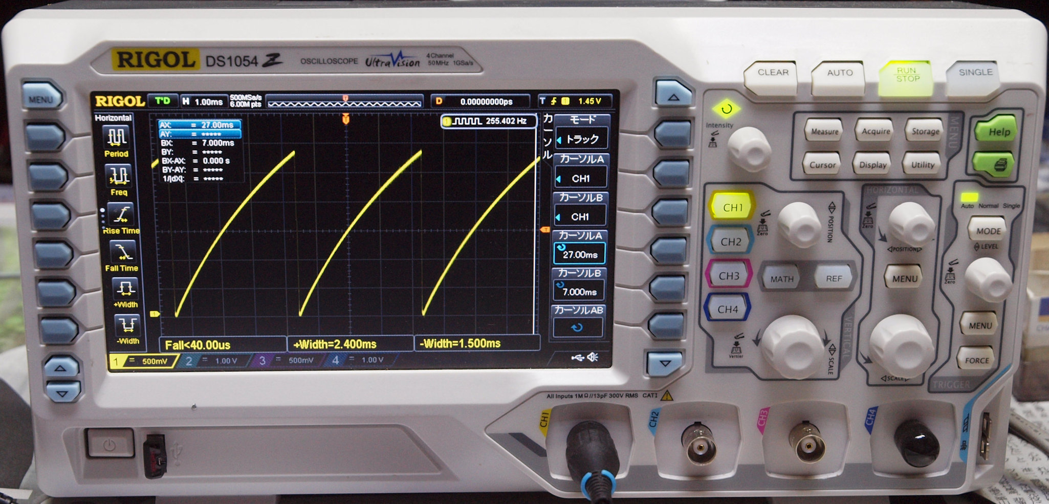 | E. 調整・測定。 画像をクリックすると、大きく(横幅2050ドット)表示されます。 E0. モーター駆動電圧をオシロで波形観測 |