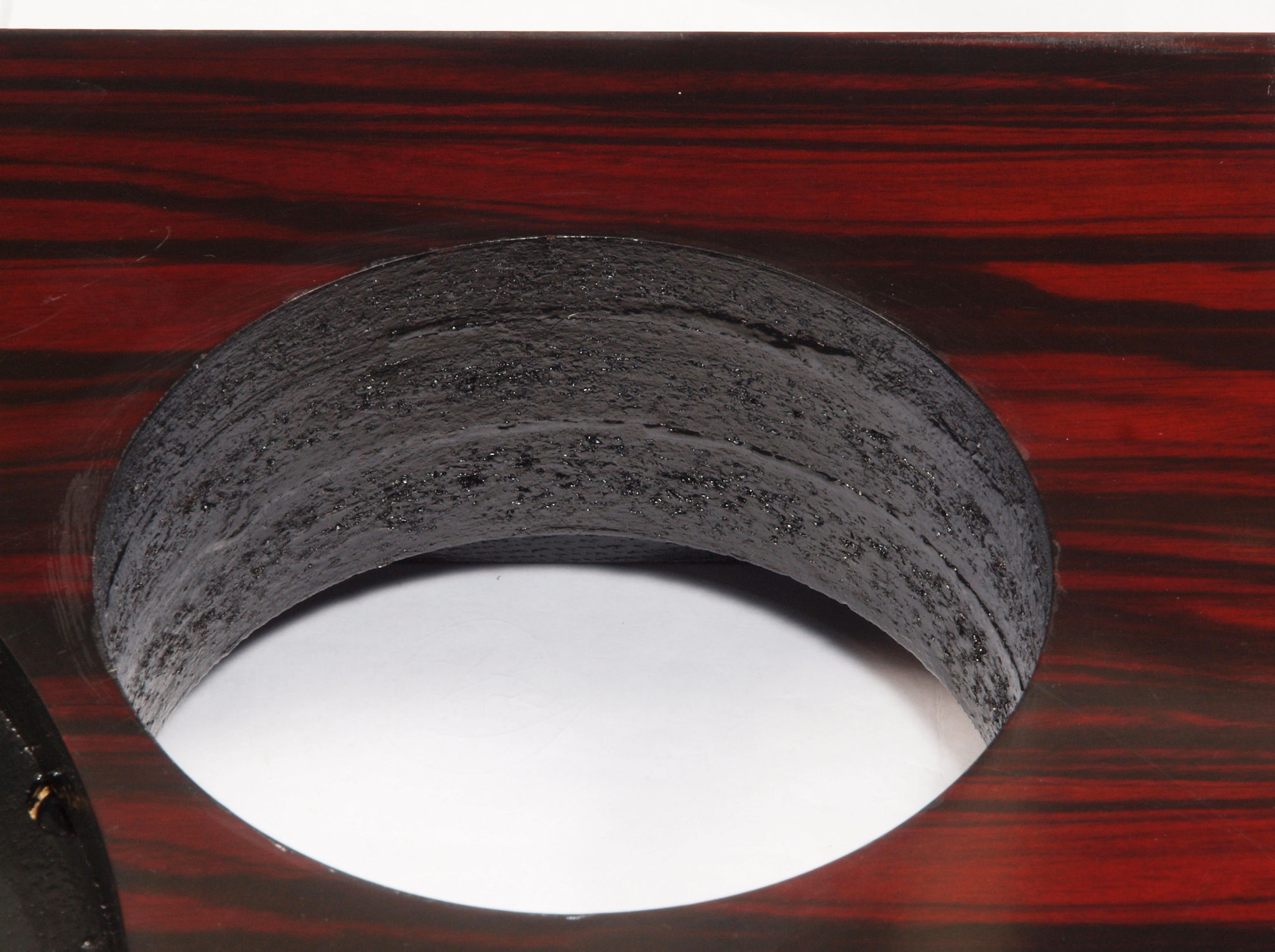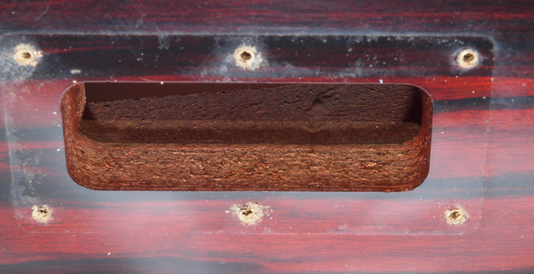 | W. 下蓋及び本体木部 修理状況。 画像をクリックすると、大きく(横幅2050ドット)表示されます。 W11. 修理前 アーム取り付け穴。 |