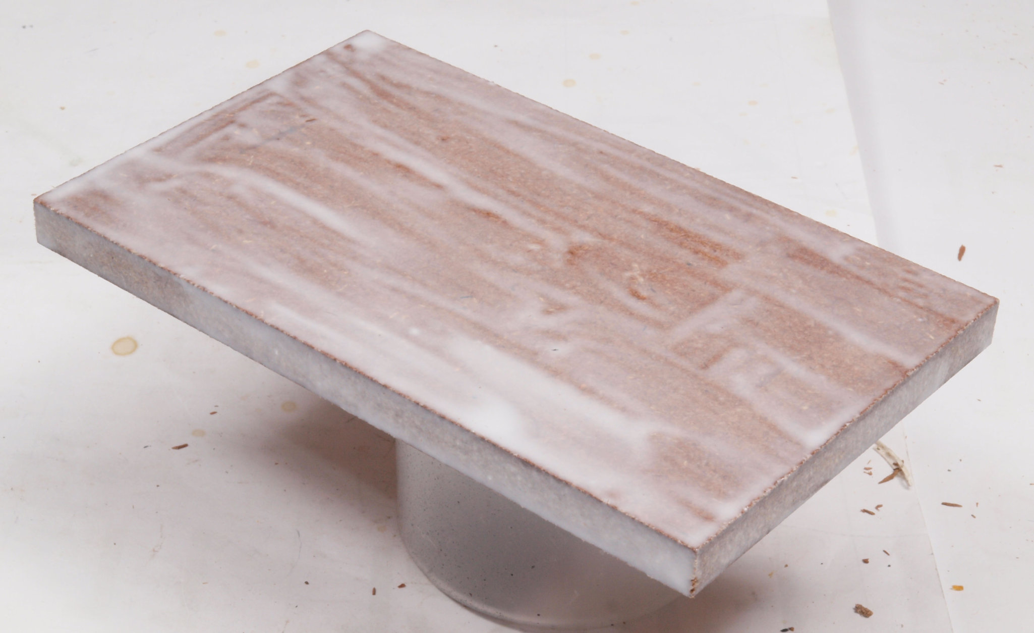 | C45. 修理中 接着材が劣化した木箱、下前右から見る。圧縮板にボンドを塗って固めている。 | ||||||||||||