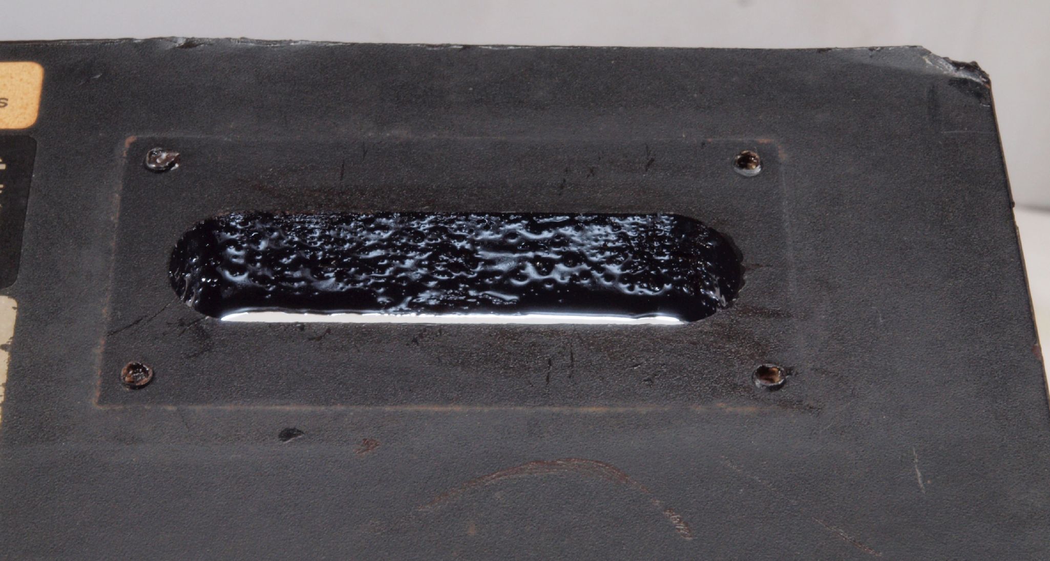 | C63. 修理後 「電源線入り口、吐出口取り付け板」 の穴。さらに、塗装する。 |