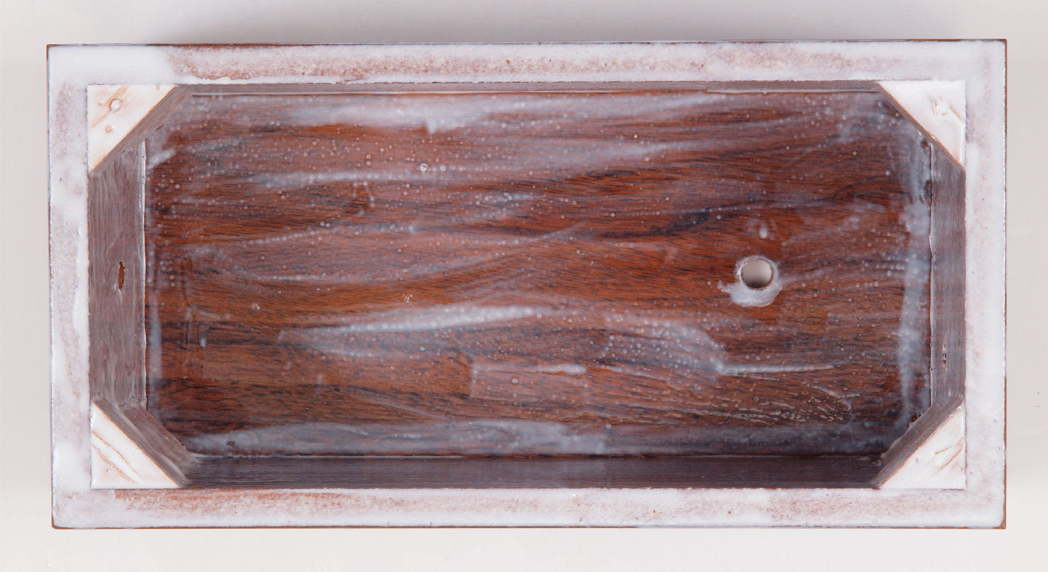 | C97. 修理中 ポンプケース木箱上蓋裏左横側。ボンドを染みこませる。 |