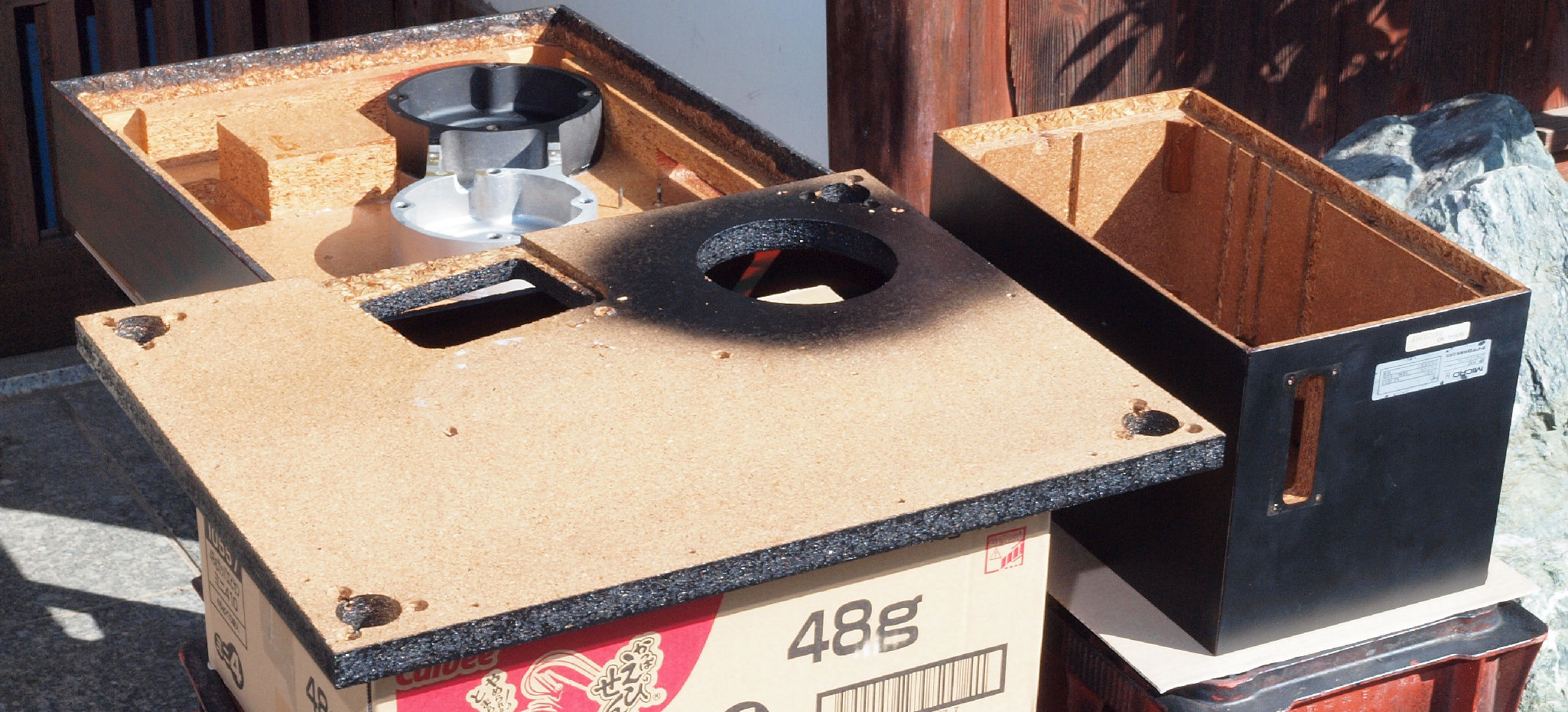 | W. 下蓋及び本体木部 修理状況。 W01. 修理前 タンテーブル軸ユニットを外した本体。アーム取付一体シャーシは接着して有るのでそのまま。 |