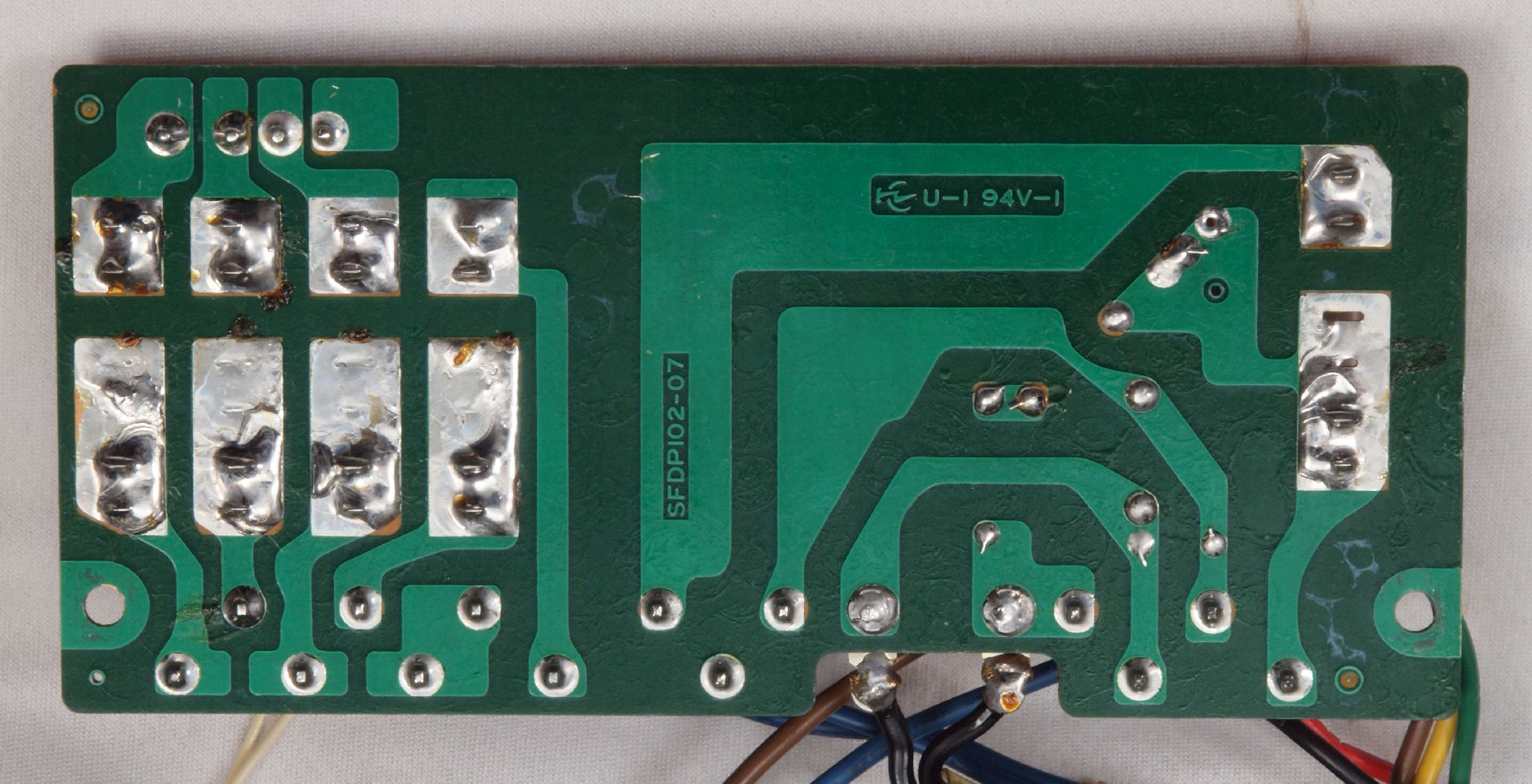 | C112. 修理前 電源定電圧基板、電解コンデンサーの液漏れ跡 | ||||||||||||||||||||||||||||||||||||