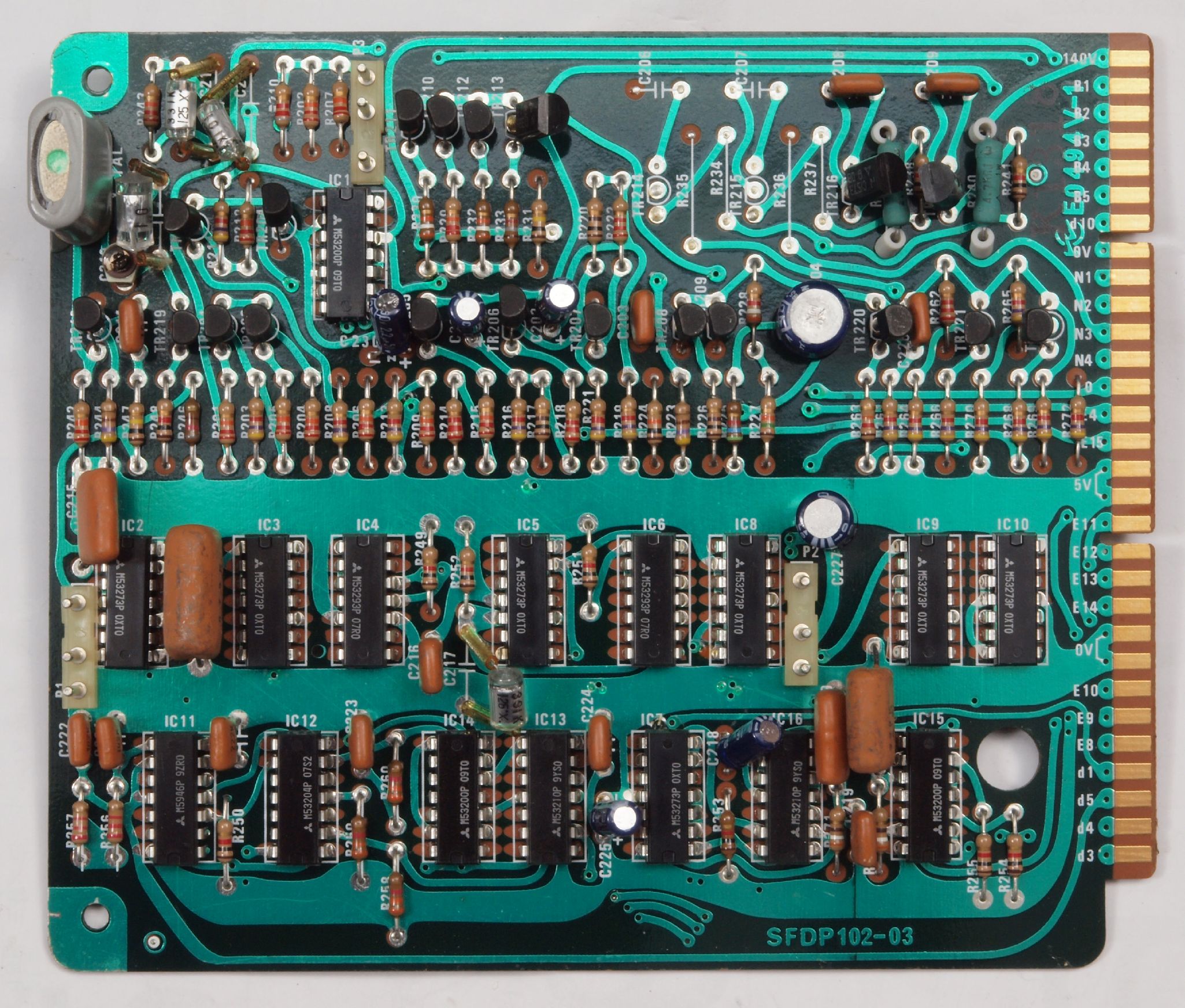 | C44. 完成基準発生・速度切替え分周基板。余分なフラックスを落として、コート液を塗る。前回の修理で割れた、角の固定穴を補強する。 | ||||||||||||||||||||||||||||||||||||