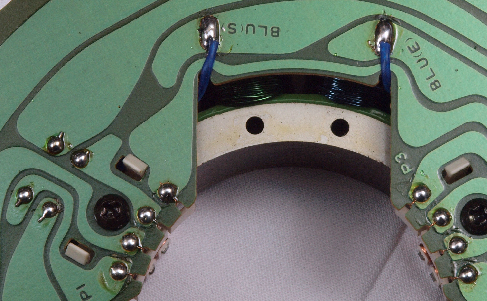 | M412. 修理中、 アマチュア(回転子)基盤裏巻線半田、引き出し線が絶縁していない!(BLUE巻線)拡大 | ||||||||||||||||||||||||||||||||||||||||