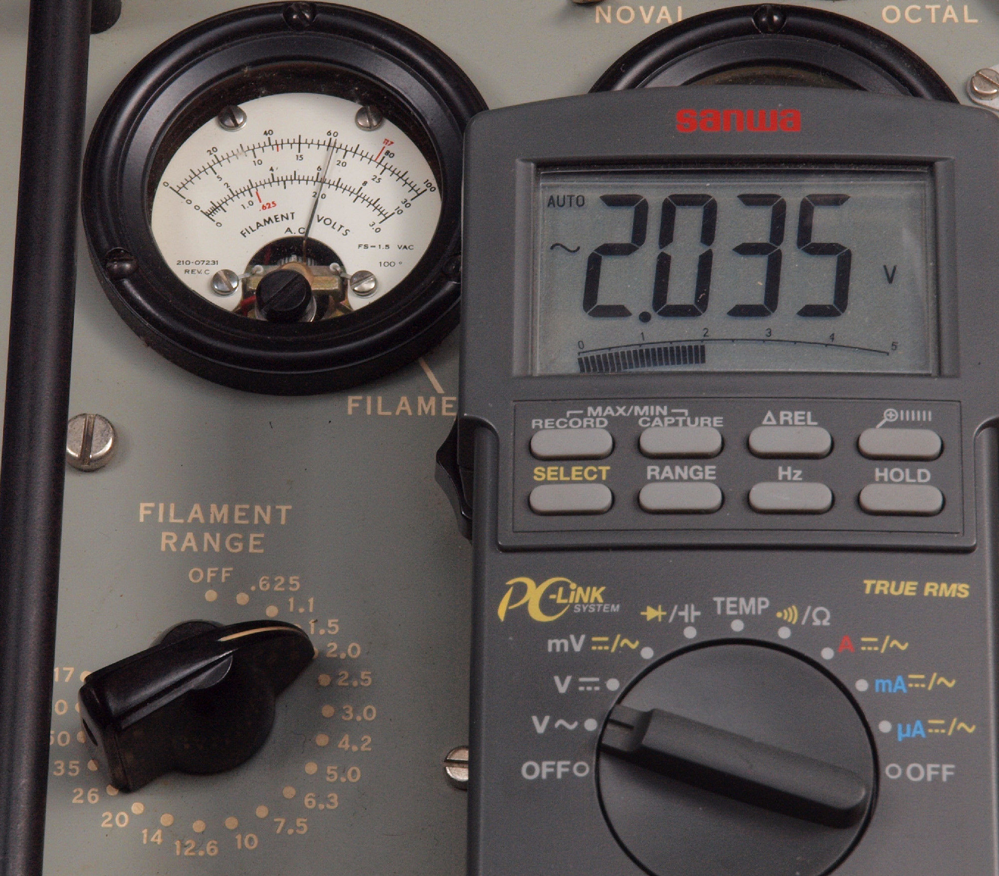 | 「整流管83」、「整流管5Y3GT」をダイオードに単純に交換すると、電源が強化する事になり、相互コンダクタンスの測定には信頼性(精度)が増すことになります。 しかし、チャートのAver.Mut.Cond.とは誤差がでます。又、他の試験方法にも誤差がでます。よって、回路の変更、全体的な調整・校正が必要となります。 | |||||||||||||||||||||||||||||||||
