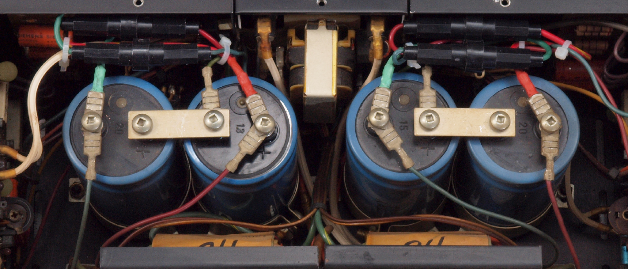 終段TR(トランジスター)への+−電源にそれぞれヒューズが挿入されている。左右で4本使用。