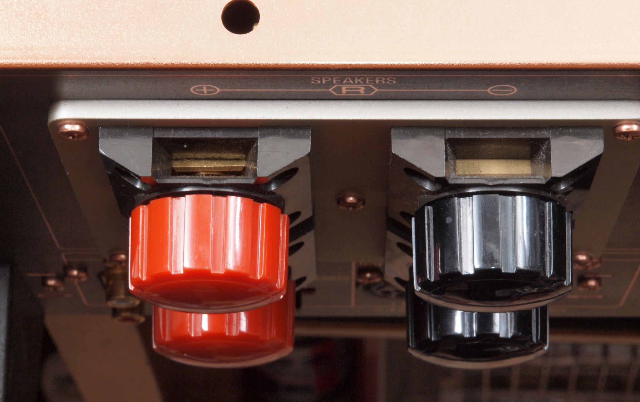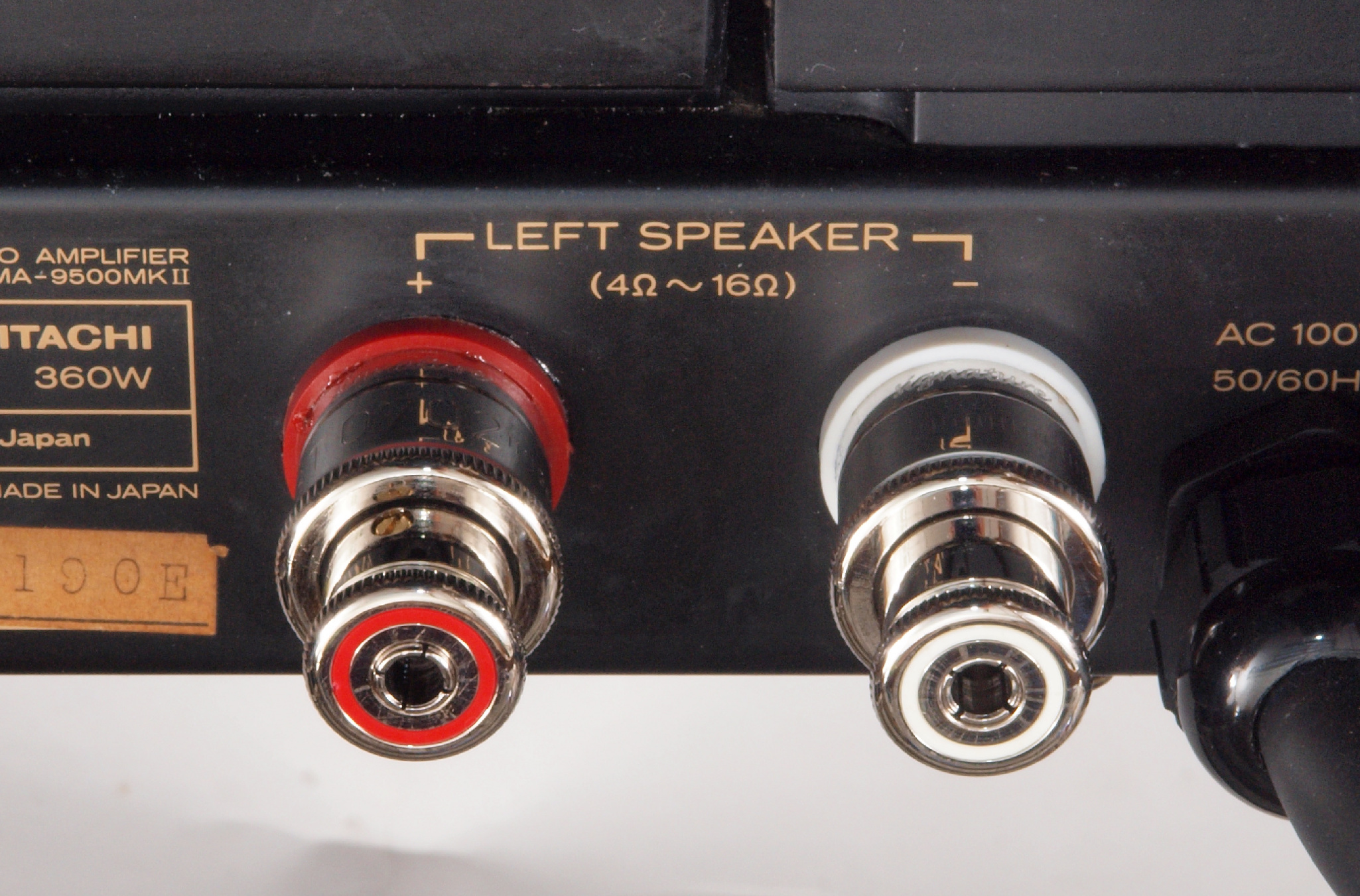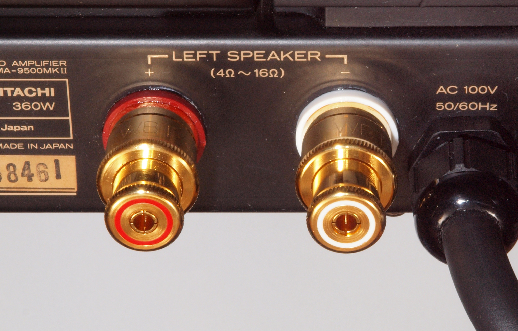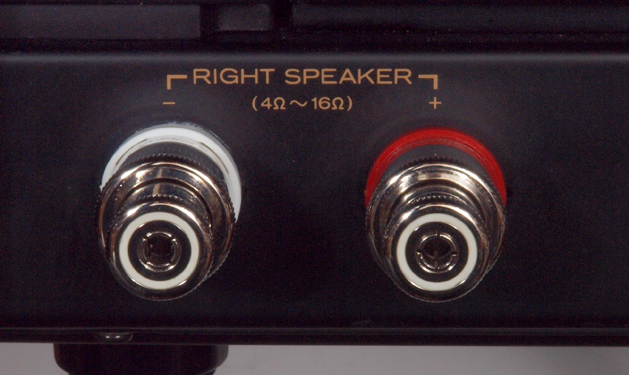 | 最近は、音質改善の為、極太のSP(スピーカー)ケーブルを使用する人が多い。 しかし、古い機器はそれら使用を想定しておらず、端子破損に成りやすい、出来る事なら、事前に補強すると良い。 又、ケーブルの重みで端子その物に負担が掛かり、接触不良や破壊に成りやすいので、架台等を利用してケーブルを固定して、端子に荷重が架からないようにすると良い。 |