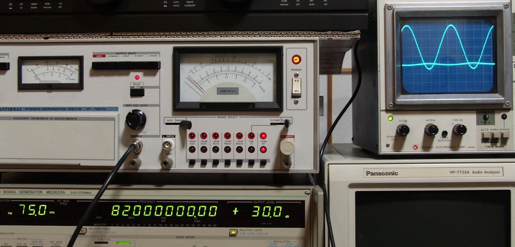 | E. 調整・測定 E1. 感度測定調整 機器の機能 左中=FMステレオ信号発信器 左=高周波信号発信器 右上=オシロ(上=R出力、下=L出力) 下左側=歪み率計(上=R出力、下=L出力) |