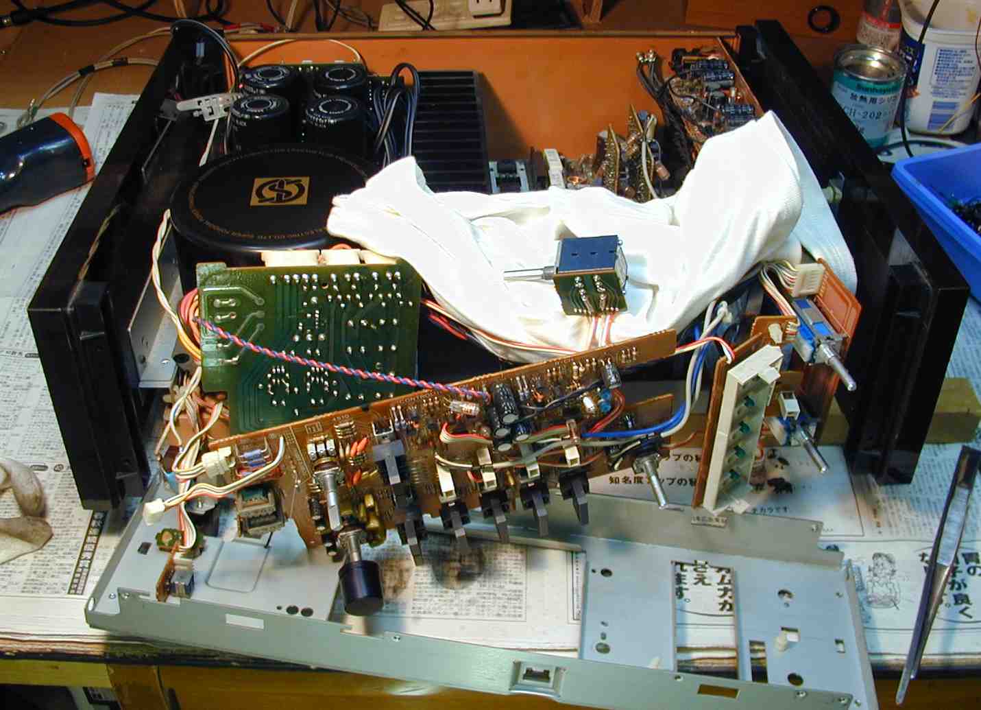 | 3.VR(ボリュウム)/SW類のガリを修理する為に、前面パネルを取り固定シャーシを外したところ。 |