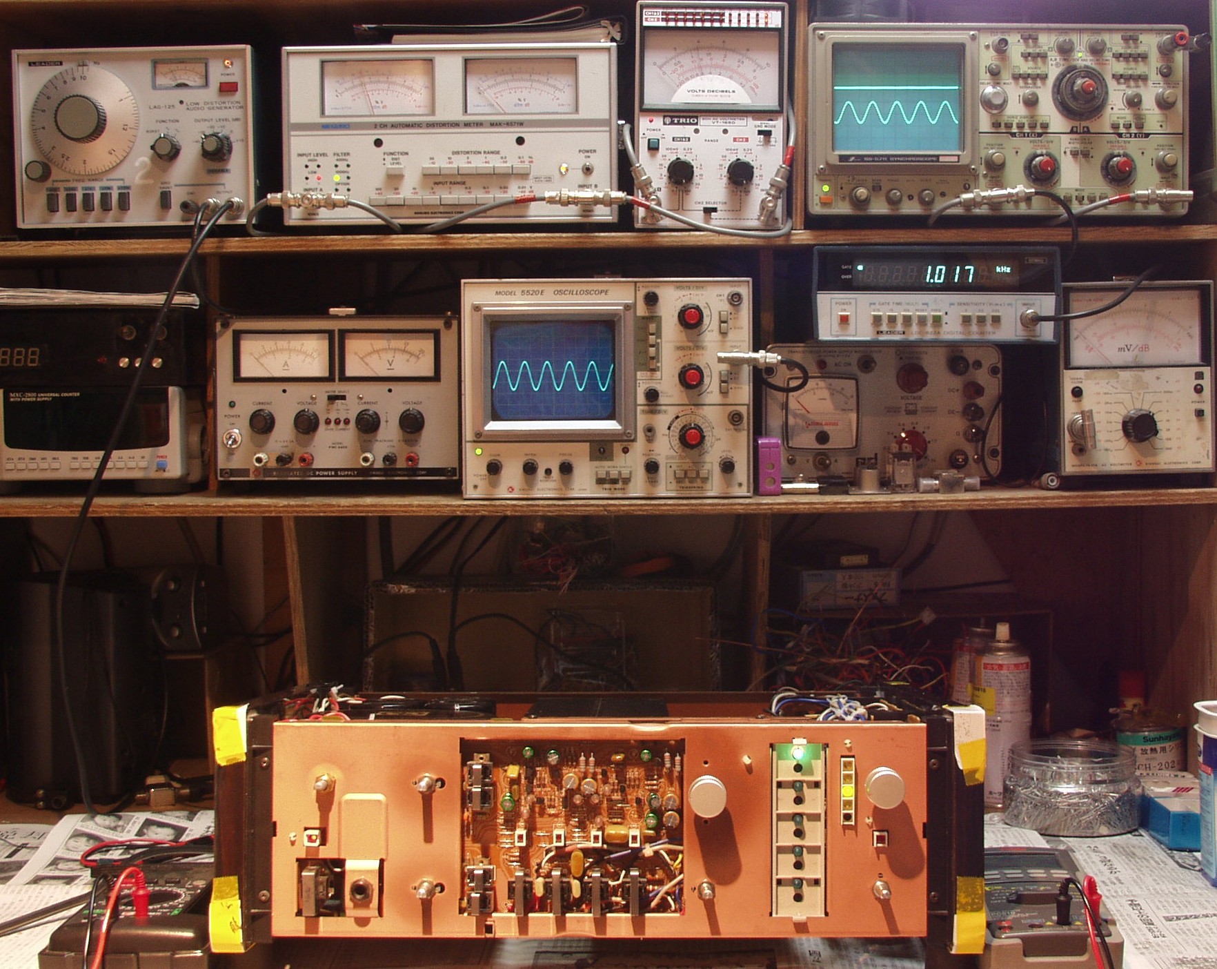 | E. 調整・測定。 画像をクリックすると、大きく(横幅2050ドット)表示されます。 E1. 出力/歪み率確認・調整 MC/MMの歪みが多いのは入出切り替えSW(C9A.SW基板の上の物)が多量の接点復活材の為 <見方> 上左オーディオ発振器より400HZ・1KHZの信号を出す(歪み率=約0.005%) 下中=入力波形(オーディオ発振器のTTLレベル) 下右=周波数計 上左=SP出力の歪み率測定 左メータ=L出力、右メータ=R出力 上中=SP出力電圧測定器、赤針=R出力、黒針=L出力 上右=SP出力波形オシロ 上=R出力、下=L出力(出力電圧測定器の出力) |