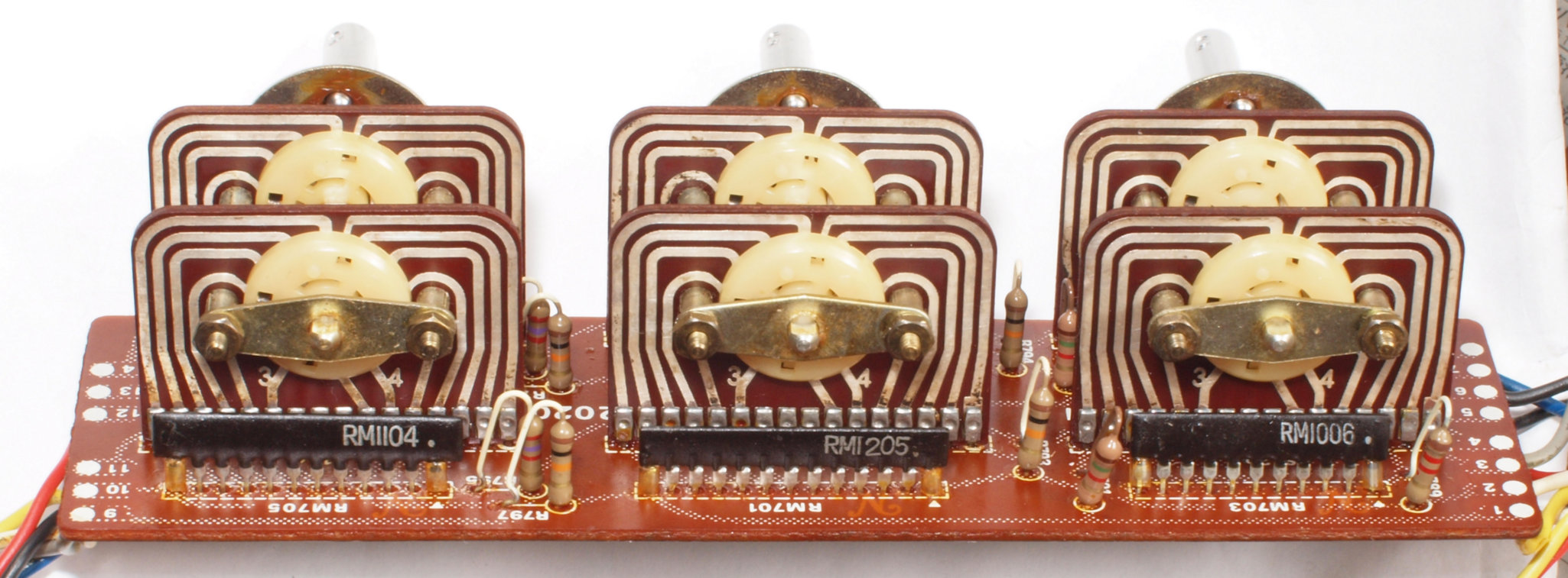 | CJ2. 修理中(洗浄)中 TAPE1入力VR、TEAP2入力VR,AUX入力VR基板裏。軸を上に向けて洗浄する。 | ||||||||||||||||||||||||||||||||||||||||||