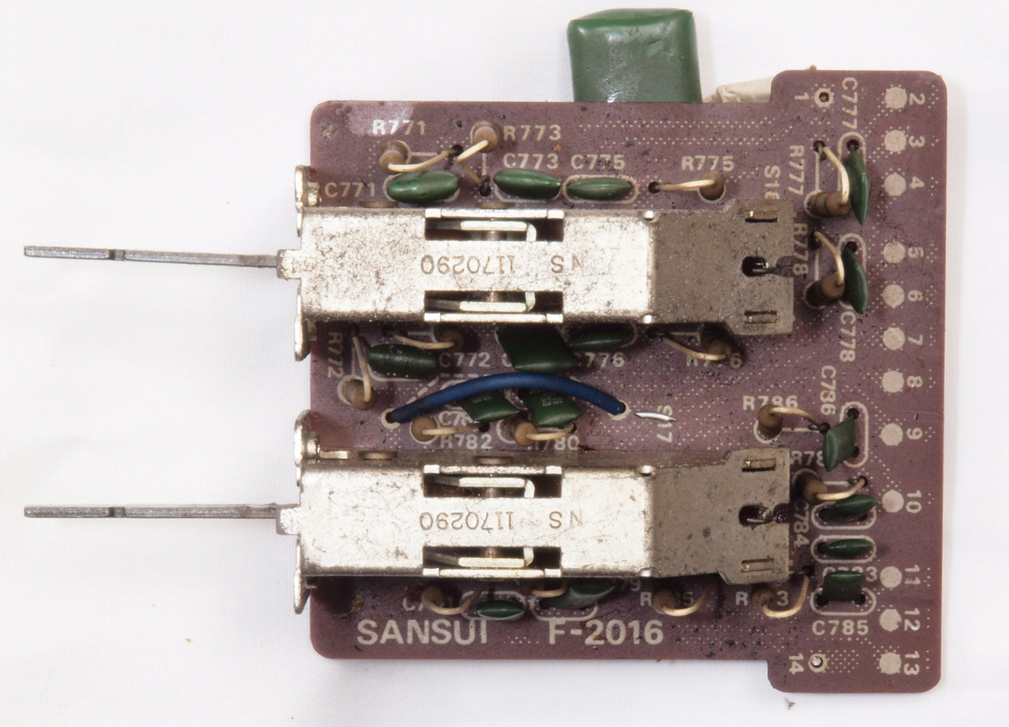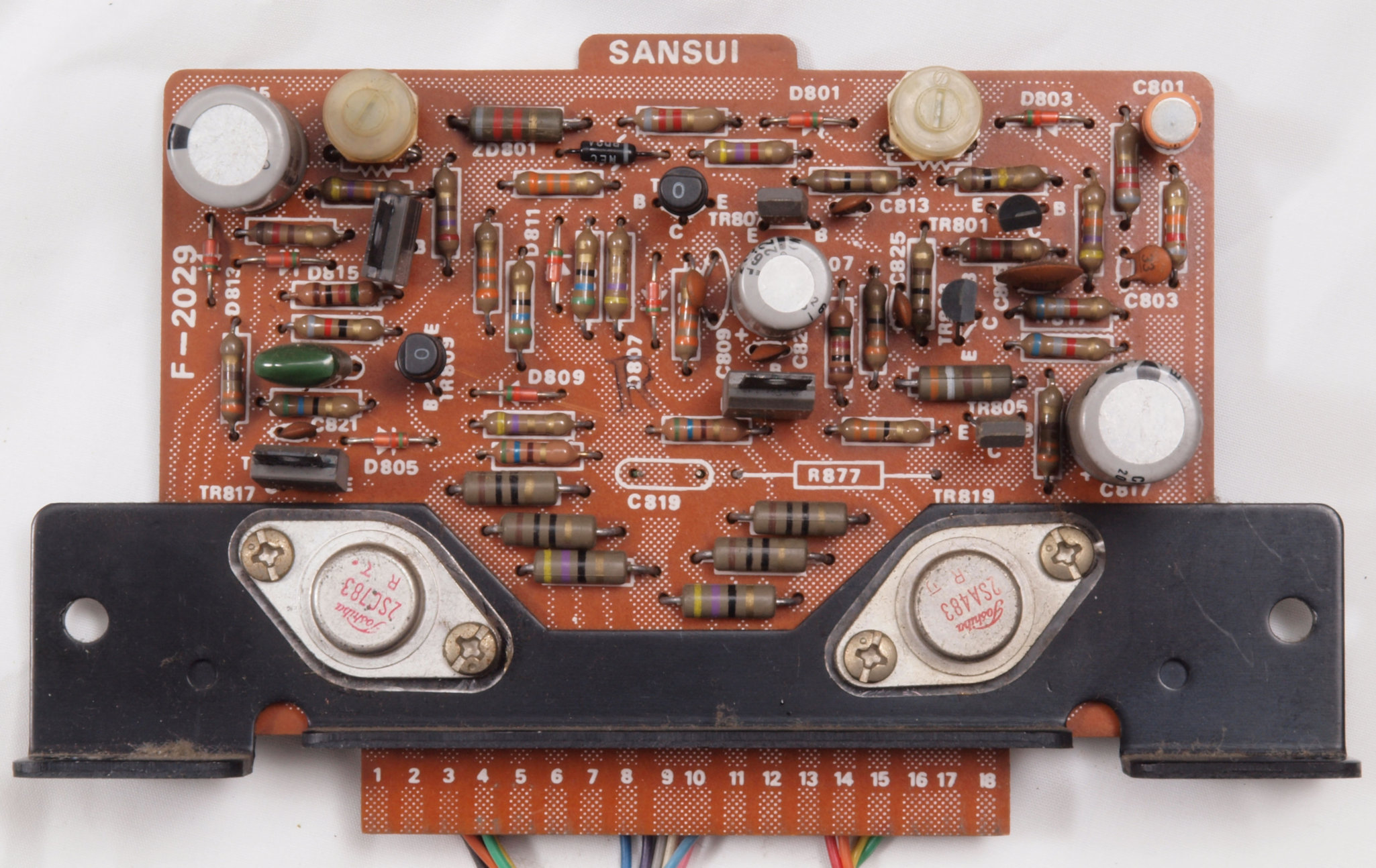 C21. 修理前 R側終段基板。 半固定VR2個、TR(トランジスター)が2個交換されている。C819とR877が取り除かれている。