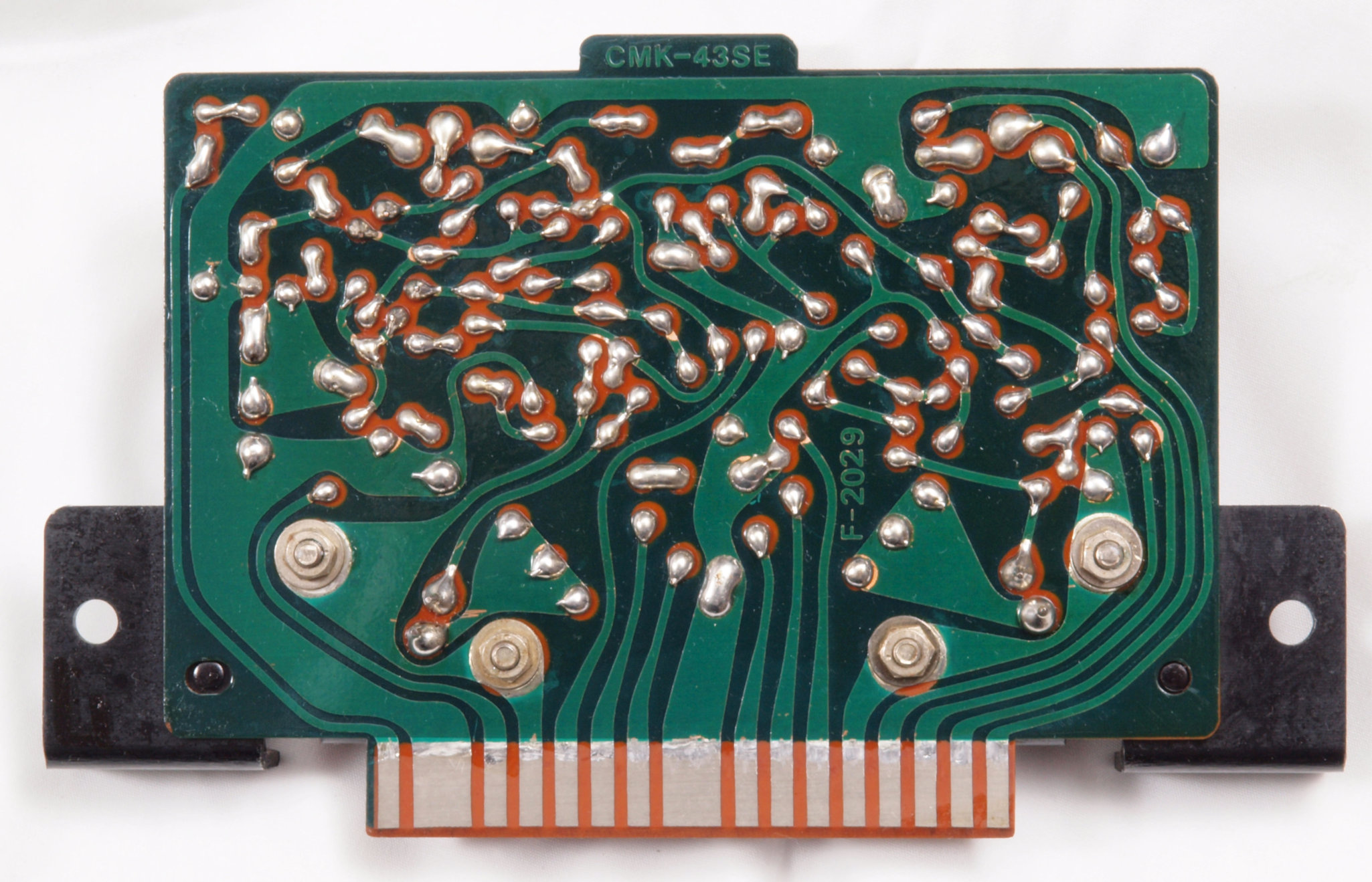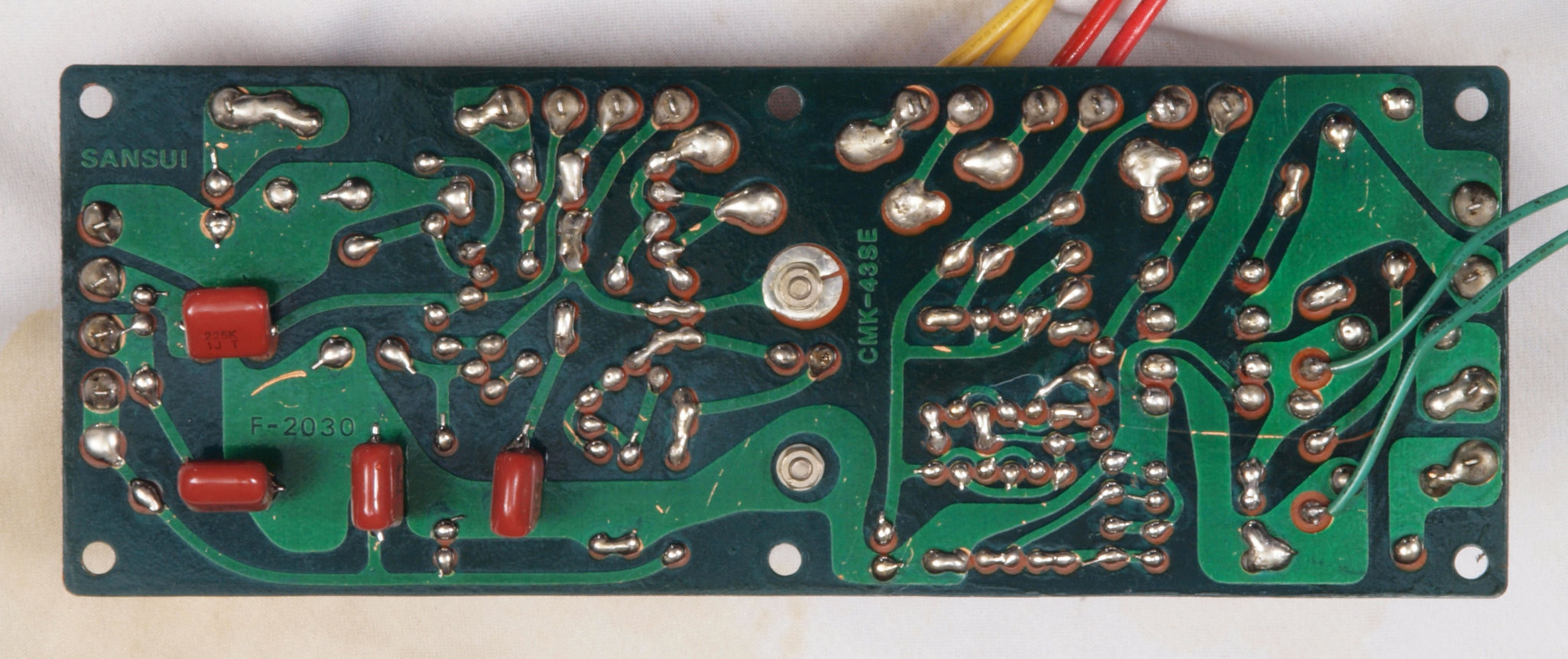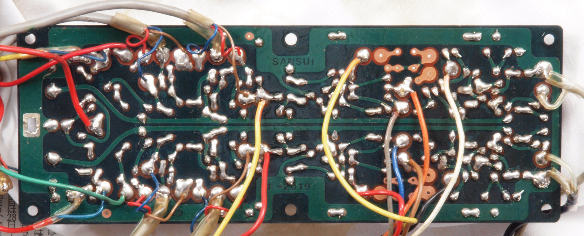 C232. 修理中 R側終段基板裏 コネクターへのバイパス配線半田付け。銅箔が浮いている。当時は定温半田コテは無、腕が悪いと銅箔はく離が生じる。