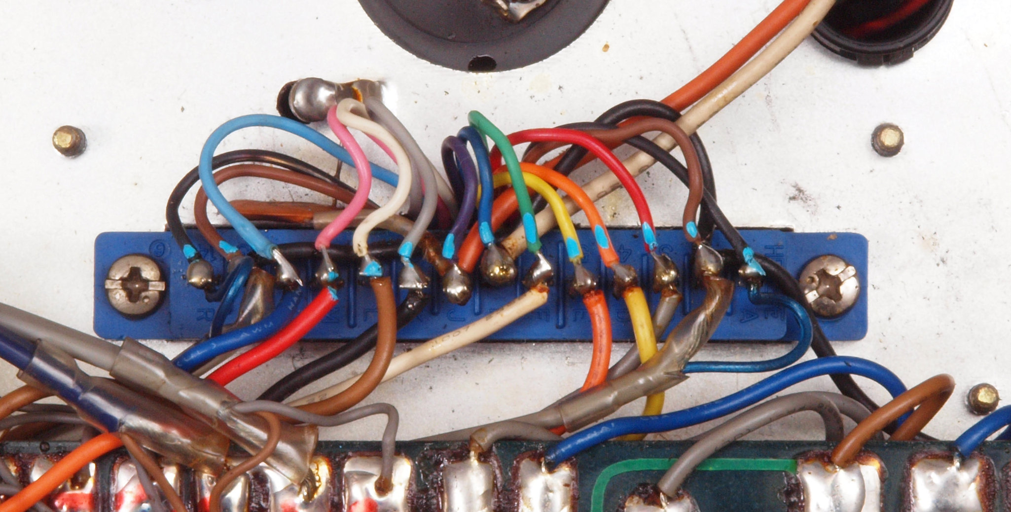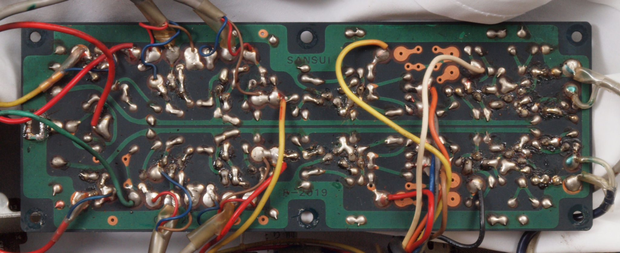 A58. 点検中 EQ−AMP基板コネクターの下配線、基板へのバイパス配線が施されている。