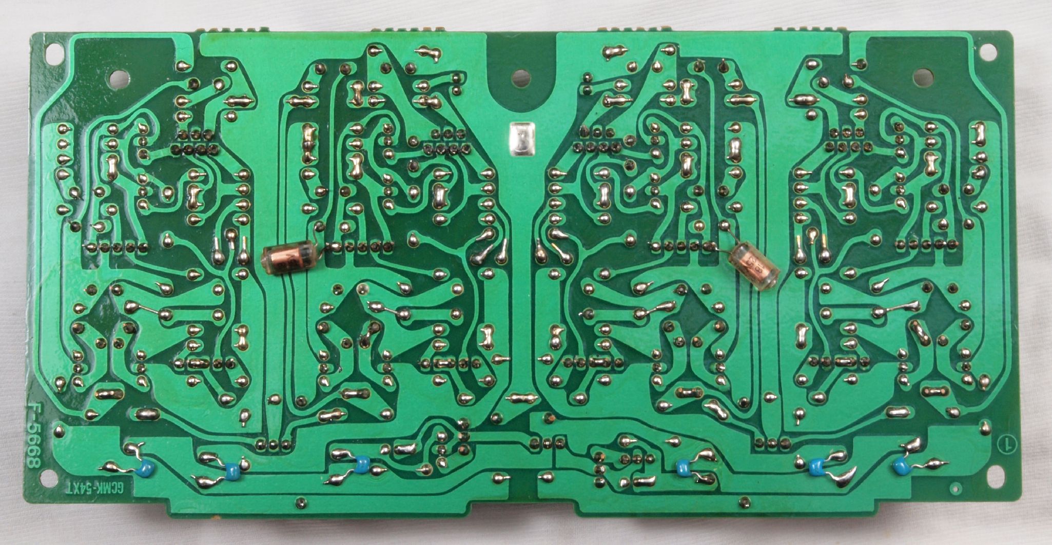 C14. 修理後(ハンダ補正) EQ基板裏  全ての半田をやり修す。 セラミックコンデンサー2個追加。