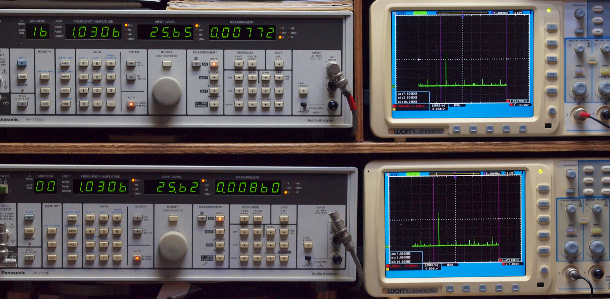 よって、ダイアル設定出力レベルより低くなります。測定機器の仕様や整備の様子はこちら、「VP−7723B」「VP−7201A」。 FFT画面の見方はこちら。
