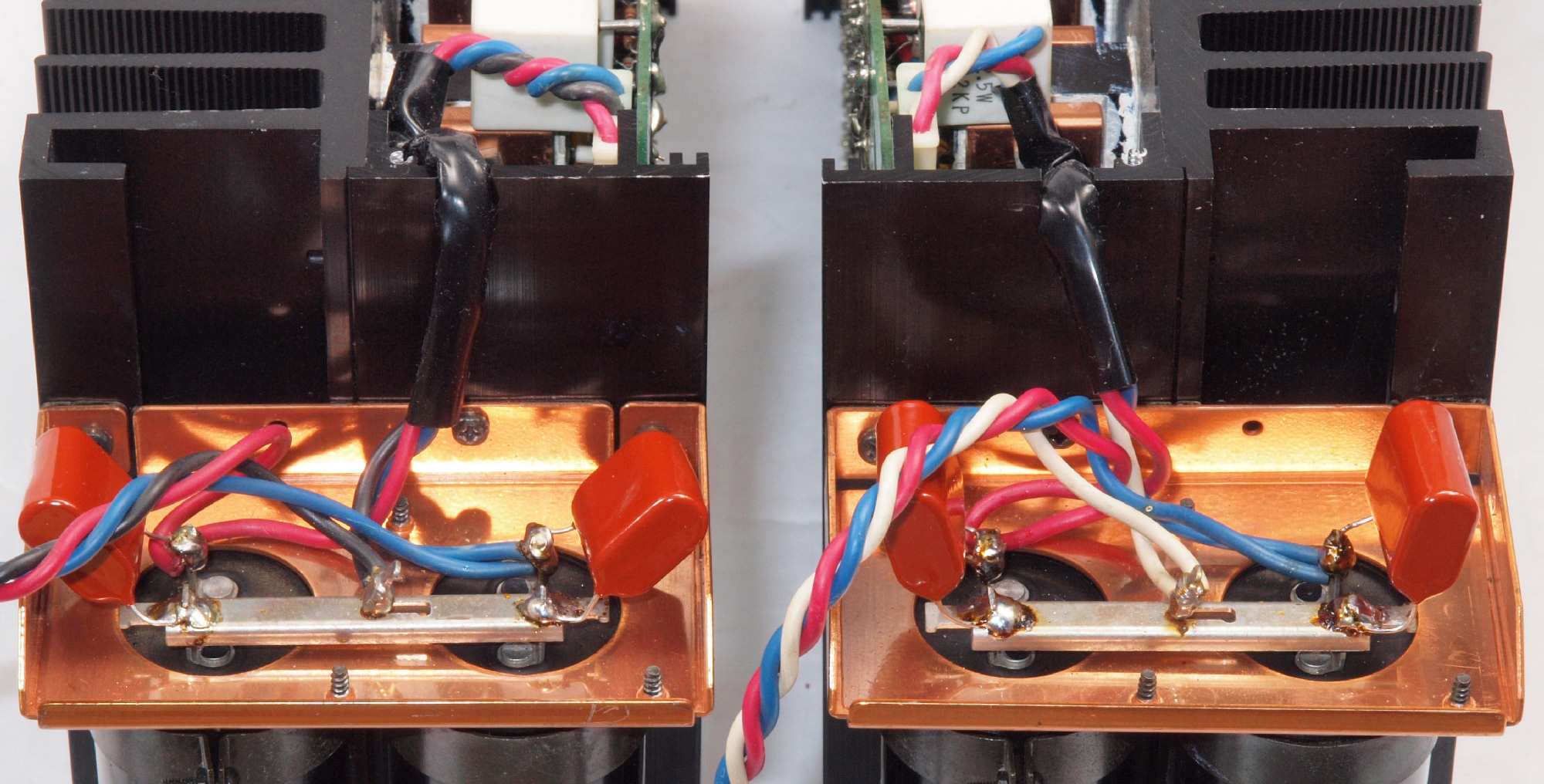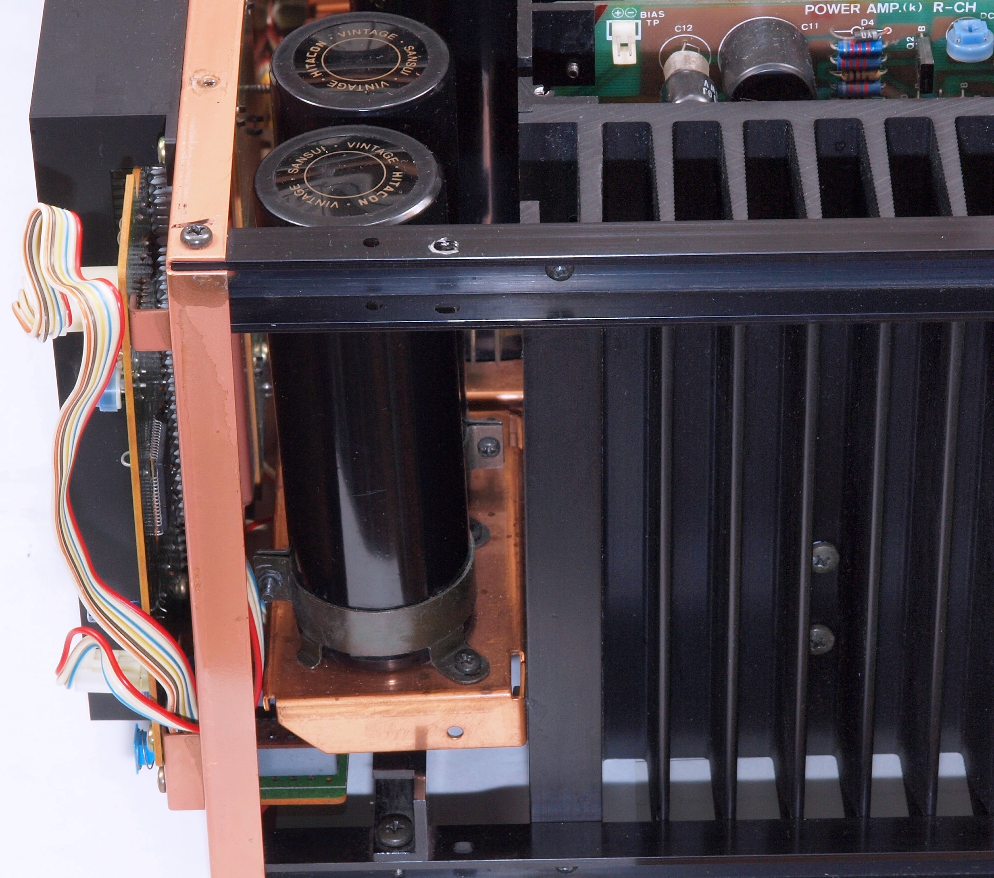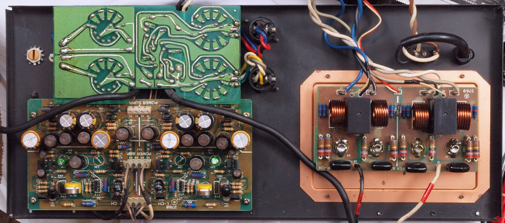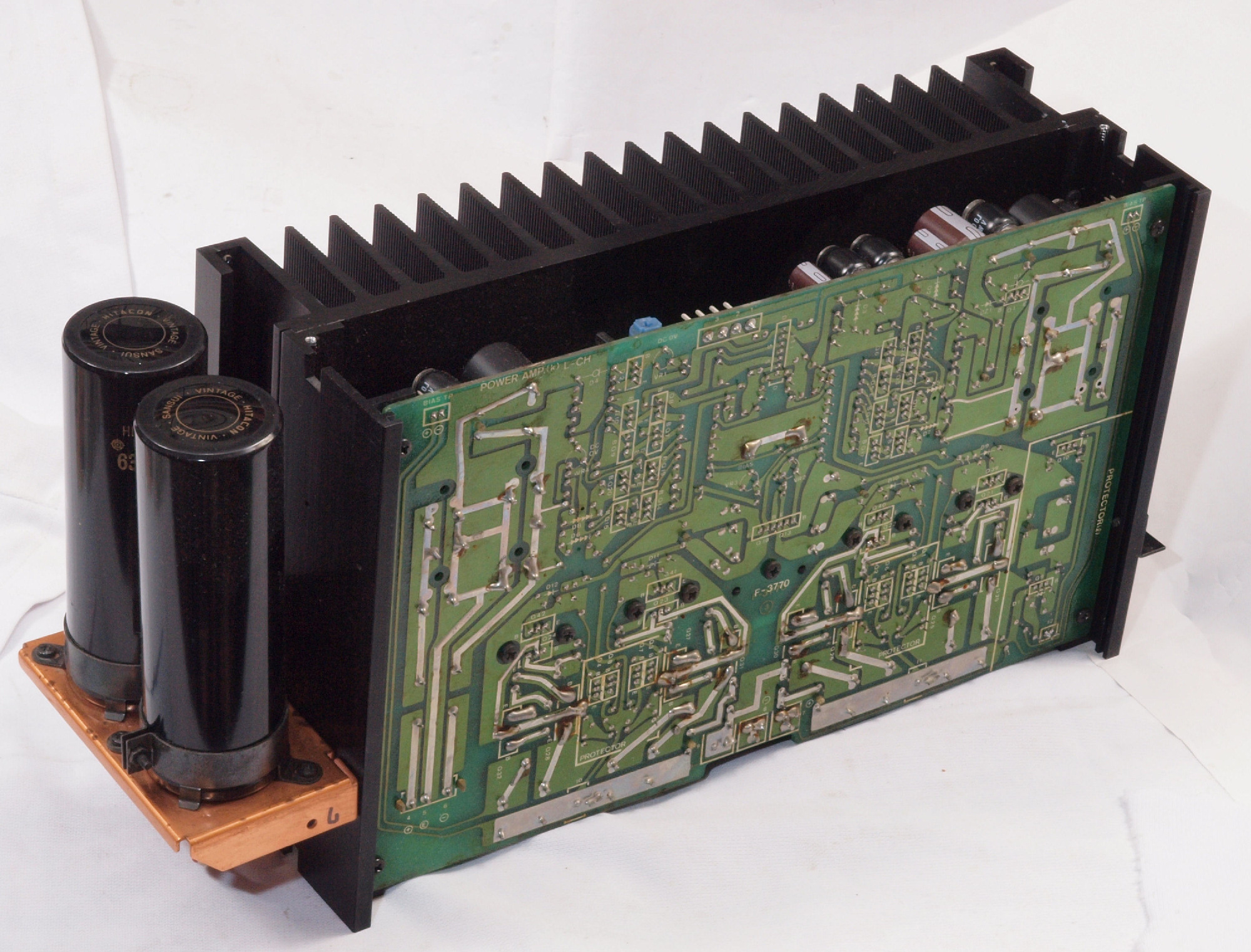 | C113. 修理中 R側AMPブロック、横取り付けの電解ブロックコンデンサー、底だけの固定なので曲がっている。 | ||||||||||||||||||||||||||||||