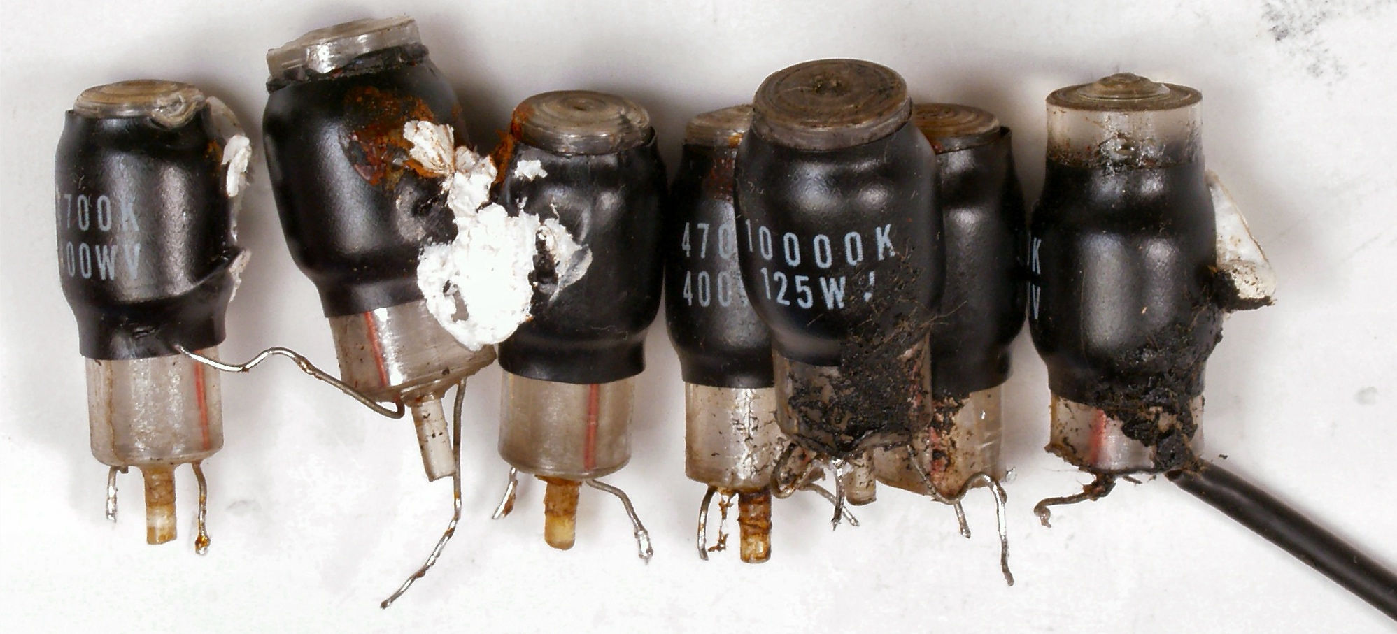 | A61. 点検中 短絡したブチルゴム巻・銅箔スチロールコンデンサー。 当時はセラミックコンデンサーの評価が低く、このようなスチコンが使われた。 電源回路のパスコンなので十分な耐圧「400V」の物を用いたが、経年変化には勝てず、短絡した。 短絡の危険を回避すべく、普通はセラミックコンデンサーを使用する。 |