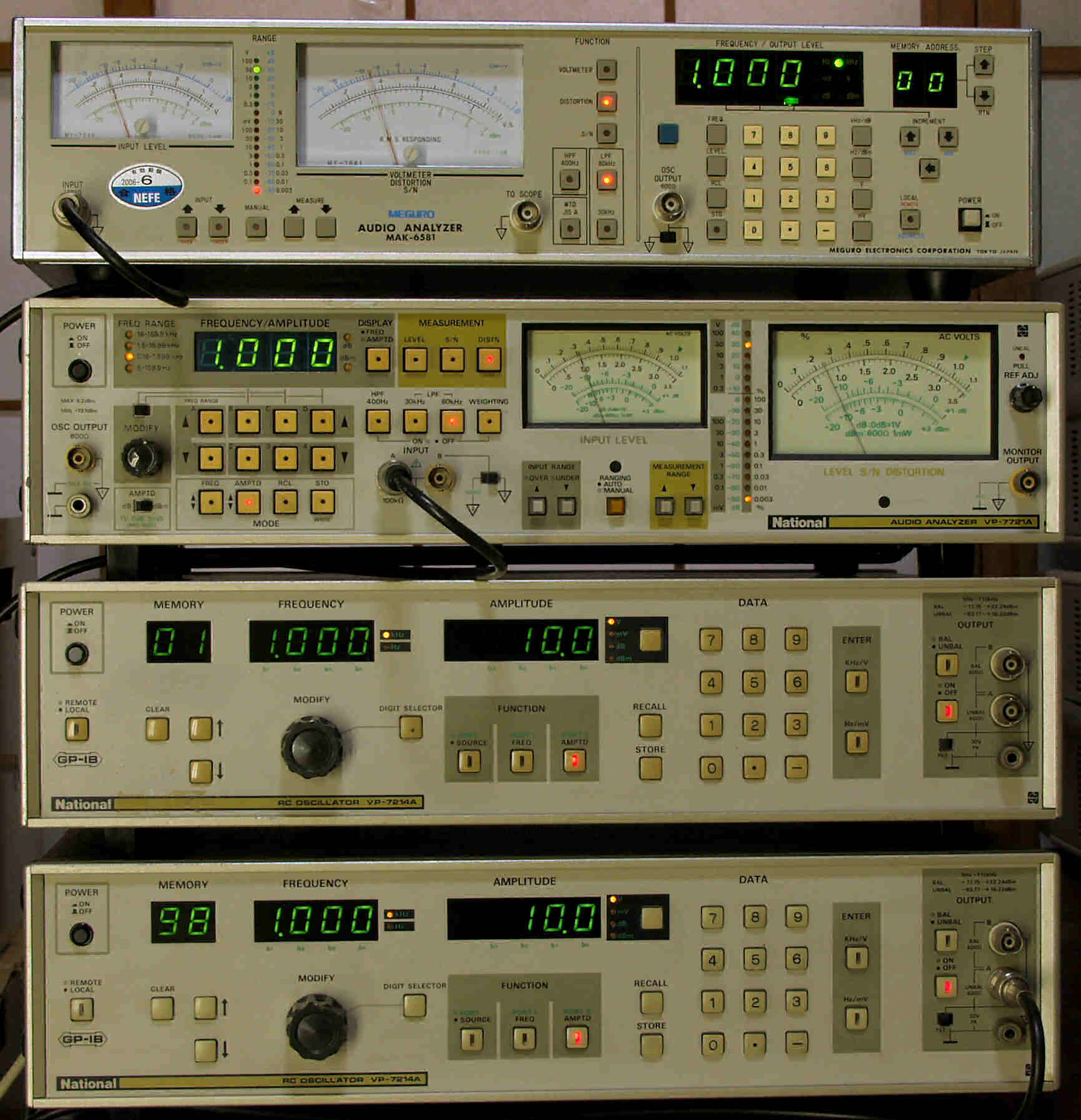 | E2. 頑張って調整する。上=MEGURO MAK−6581、 中=VP−7721A、下2台=VP−7214A。 上=MAK−6581での歪み率測定=0.0013%(0.003%レンジ、80HzBW sw入)。 取扱説明書仕様=20Hz〜10kHz、(80HzBW sw入)で残留歪み率=0.0018%以下。 中=VP−7721Aでの歪み率測定=0.001%(0.003%レンジ、80HzBW sw入)。 取扱説明書仕様=10Hz〜15.99kHz、で残留歪み率=0.0018%以下。 下=VP−7214AよりOSC出力=1kHz、10V出力。 取扱説明書仕様=不平衡出力50Hz〜10kHz、で残留歪み率=0.0001%以下。 現手持ち測定機器では測定不可 |