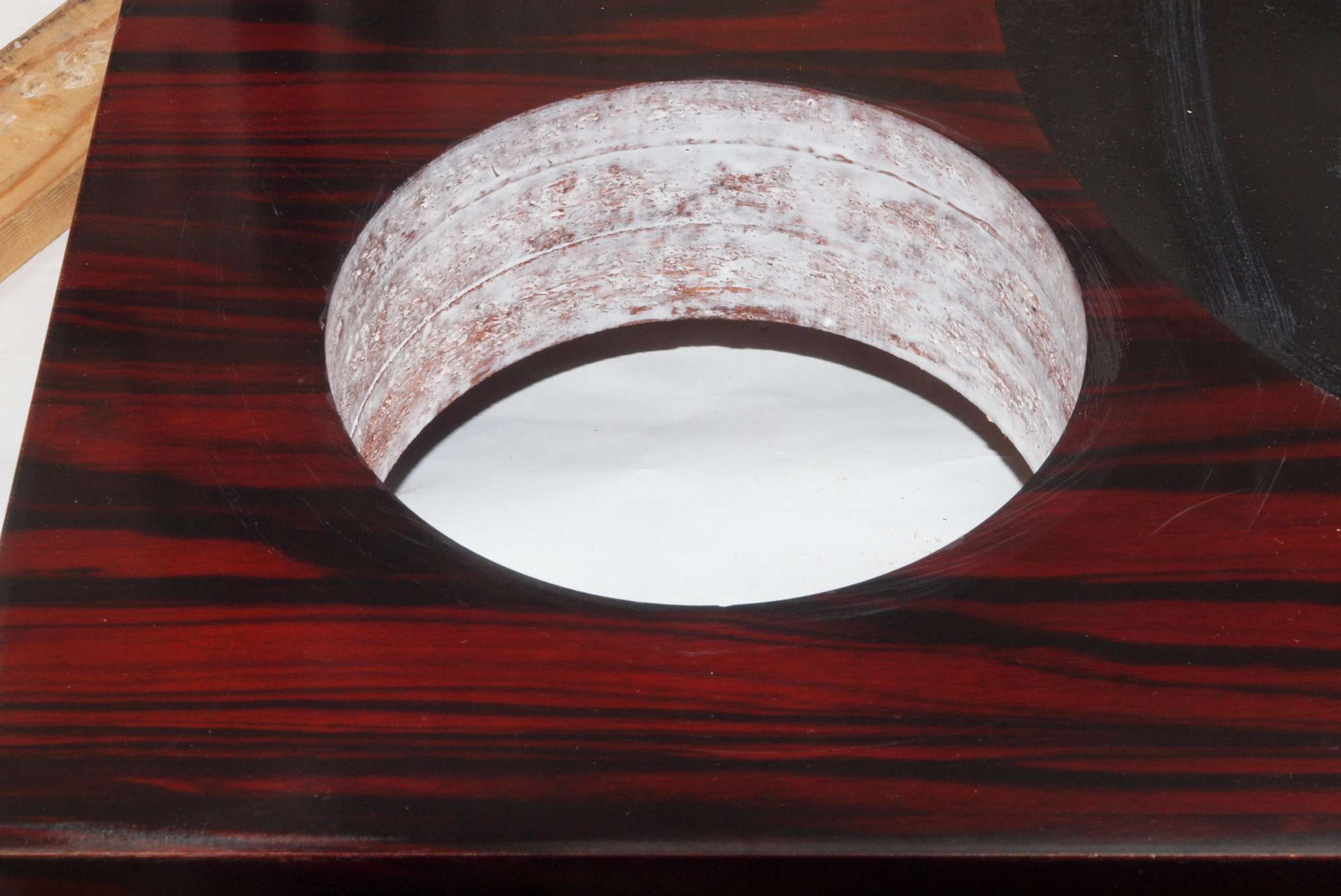 | W. 下蓋及び本体木部 修理状況。 画像をクリックすると、大きく(横幅2050ドット)表示されます。 W11. 修理前 アーム取り付け穴。 |
