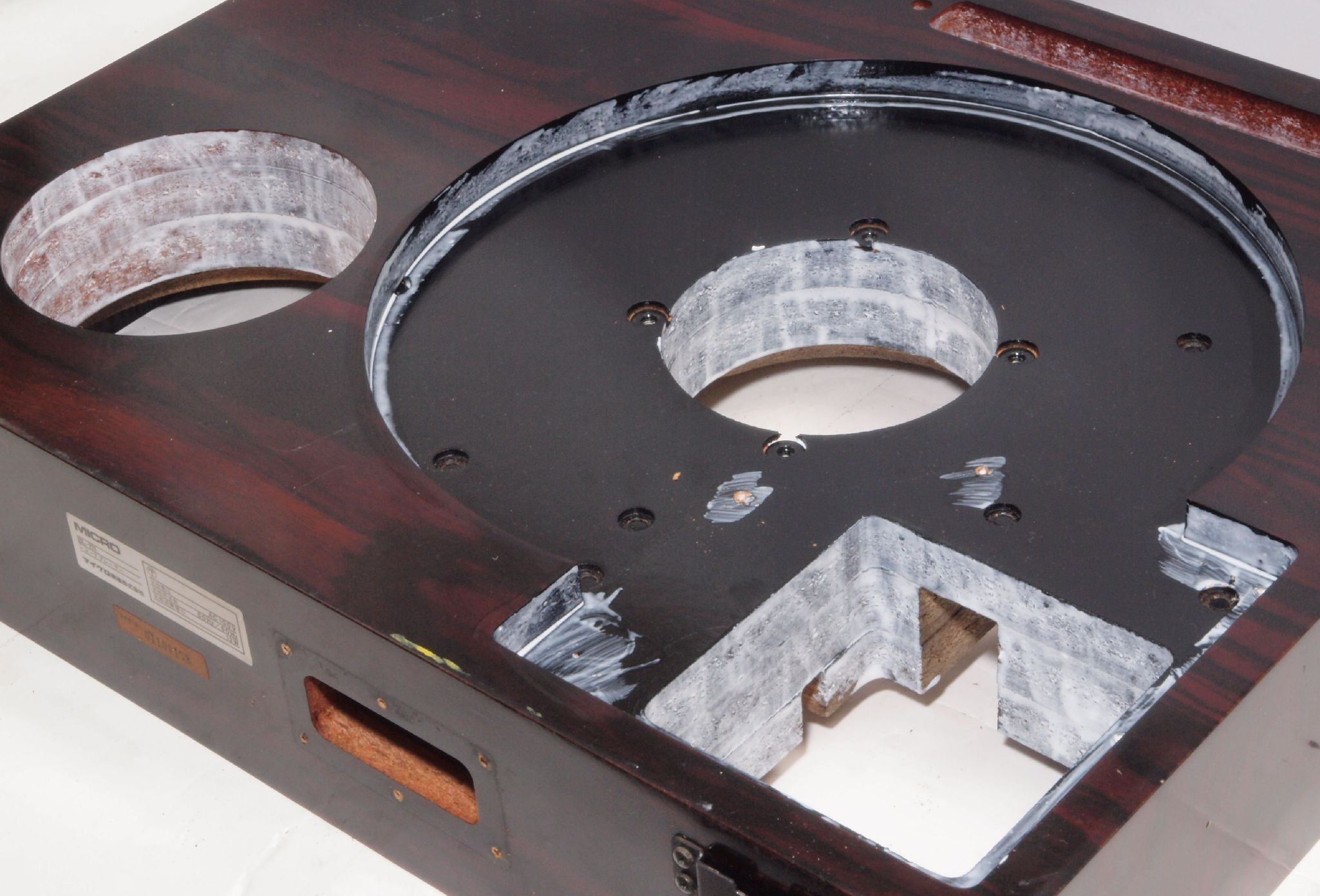 | W22. 修理中 モーター取付穴、タンテーブル軸受取付穴。 圧縮材にボンドを染みこませる。 | ||||||||||||||||||||||||||||||||||||||||||||||||||||