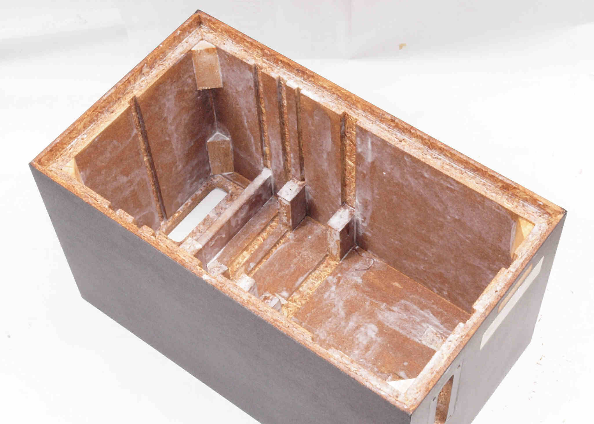 | C48. 修理中 接着材が劣化した木箱、下後左から見る。圧縮板にボンドを塗って固めている。 | ||||||||||||