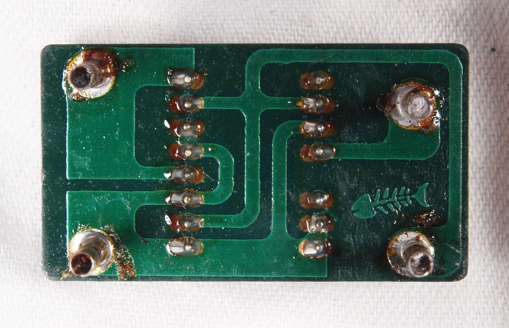 | C14. 修理(再半田)後 電源・LED表示基板裏。 半田を全部やり直す。フイルムコンデンサー2個追加。 | ||||||||||||||||||||||||||||||||||||||||