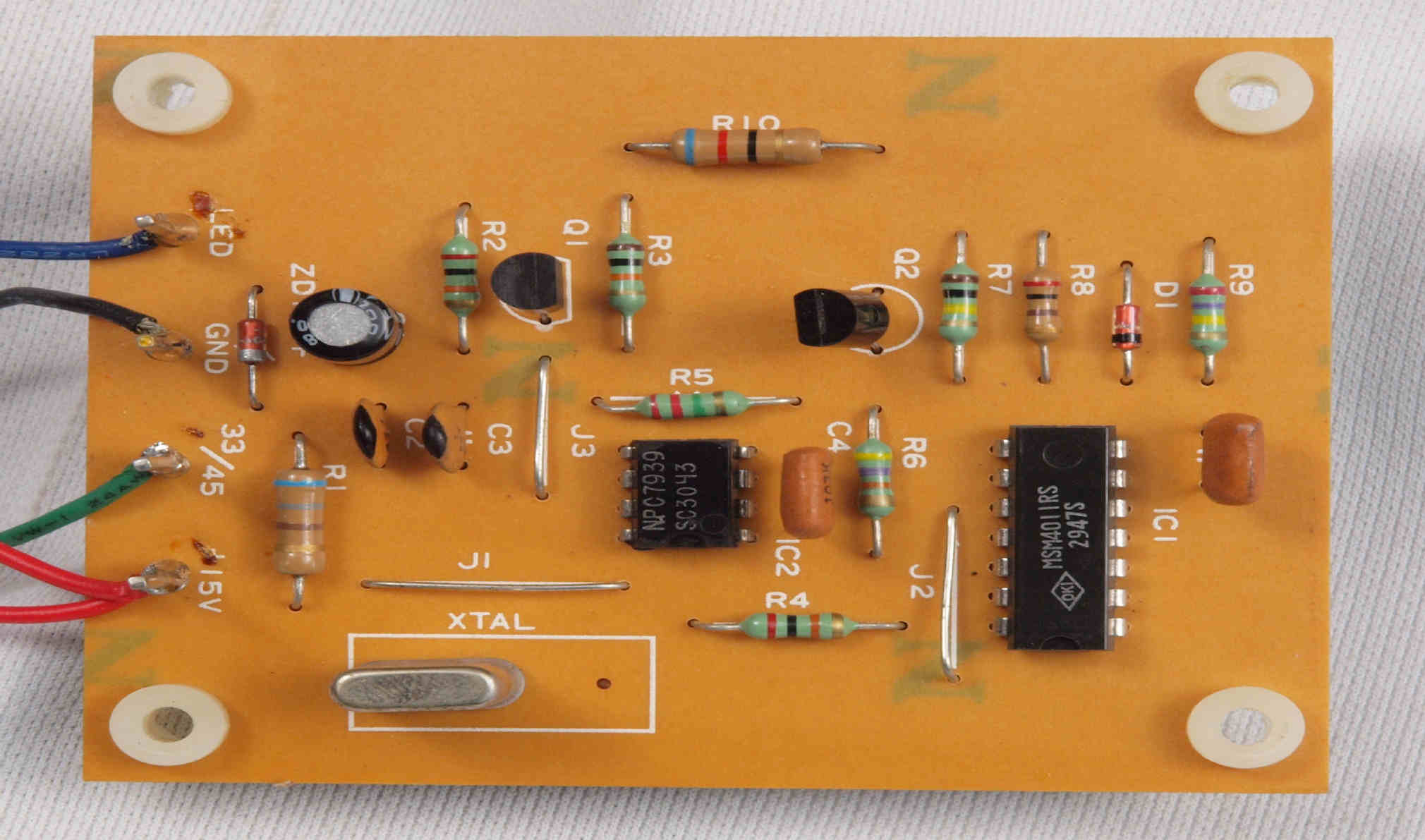C25. 完成電源・33/45切替基板裏。余分なフラックスを落として、コート液を塗る。