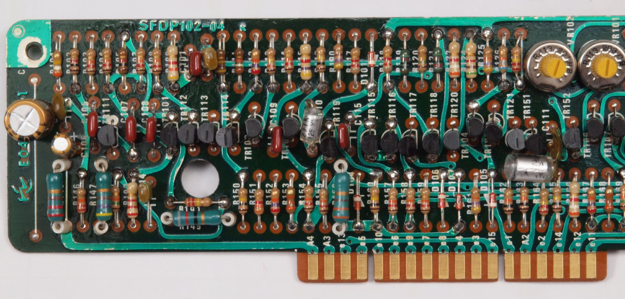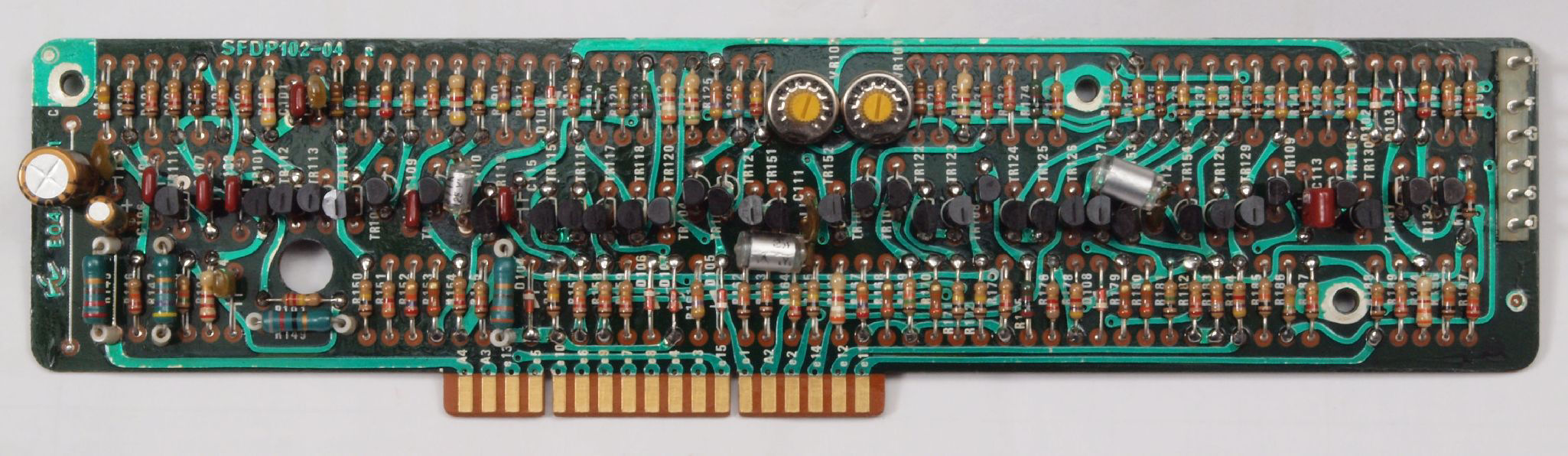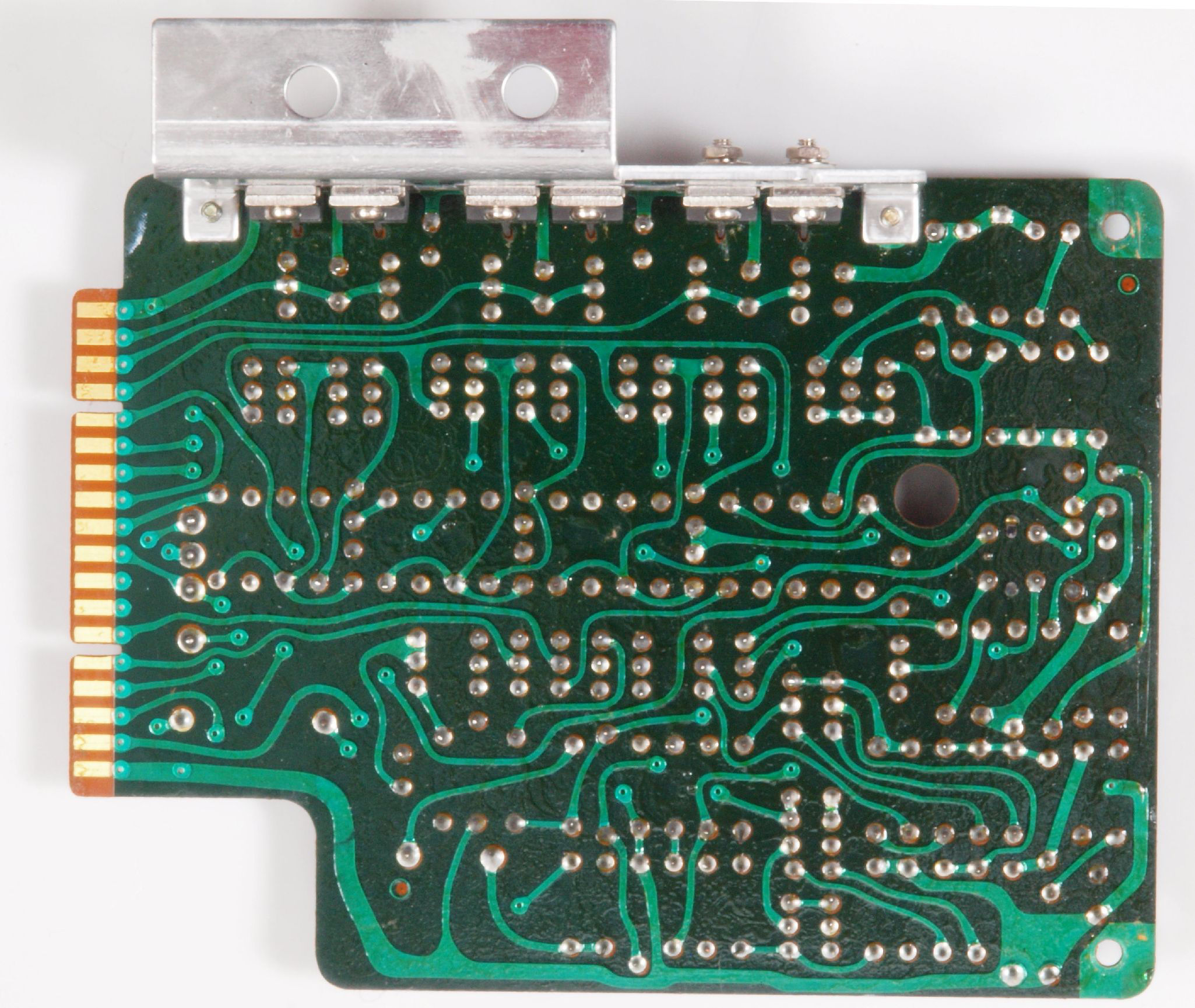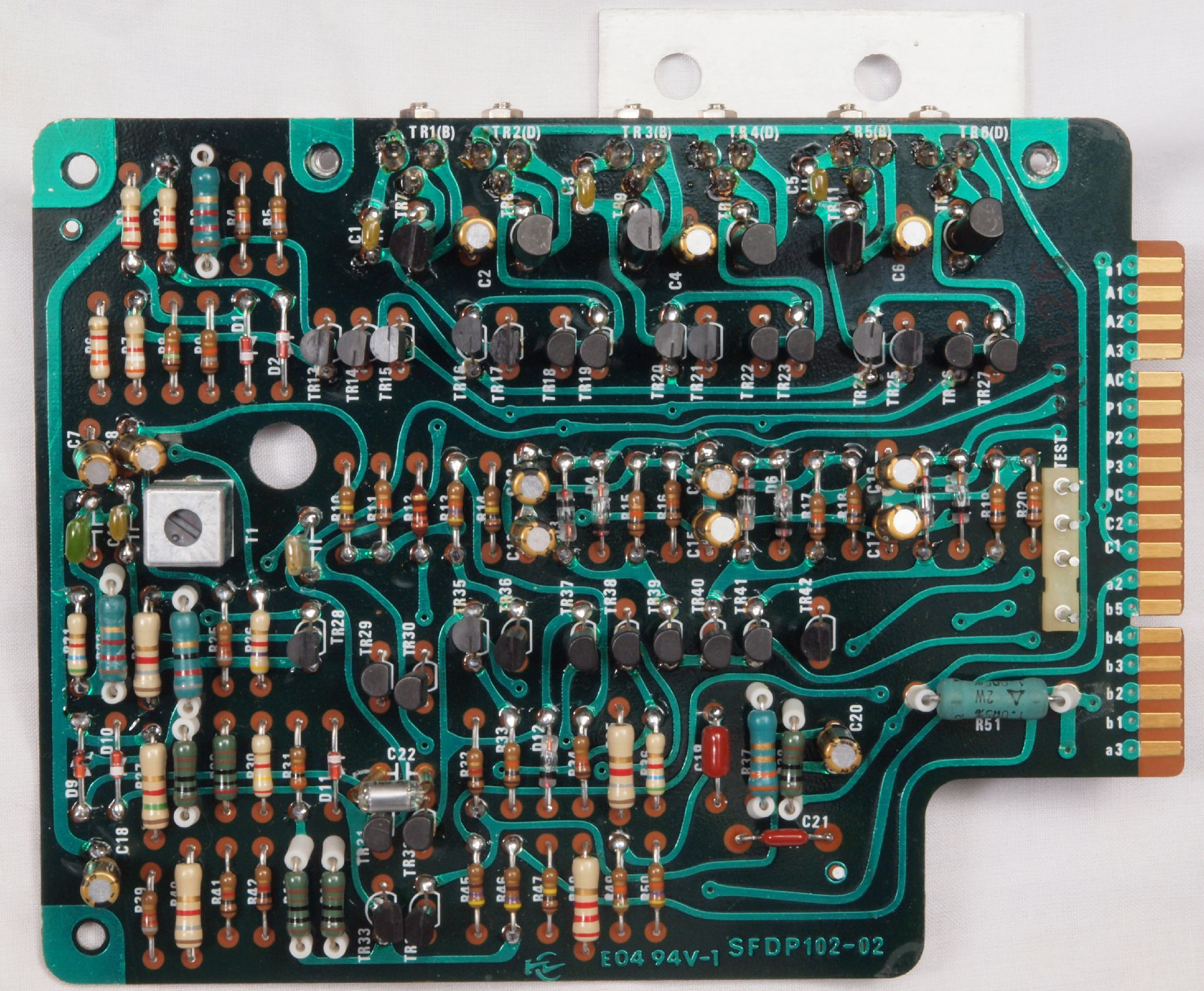 | C44. 完成基準発生・速度切替え分周基板。余分なフラックスを落として、コート液を塗る。前回の修理で割れた、角の固定穴を補強する。 | ||||||||||||||||||||||||||||||||||||