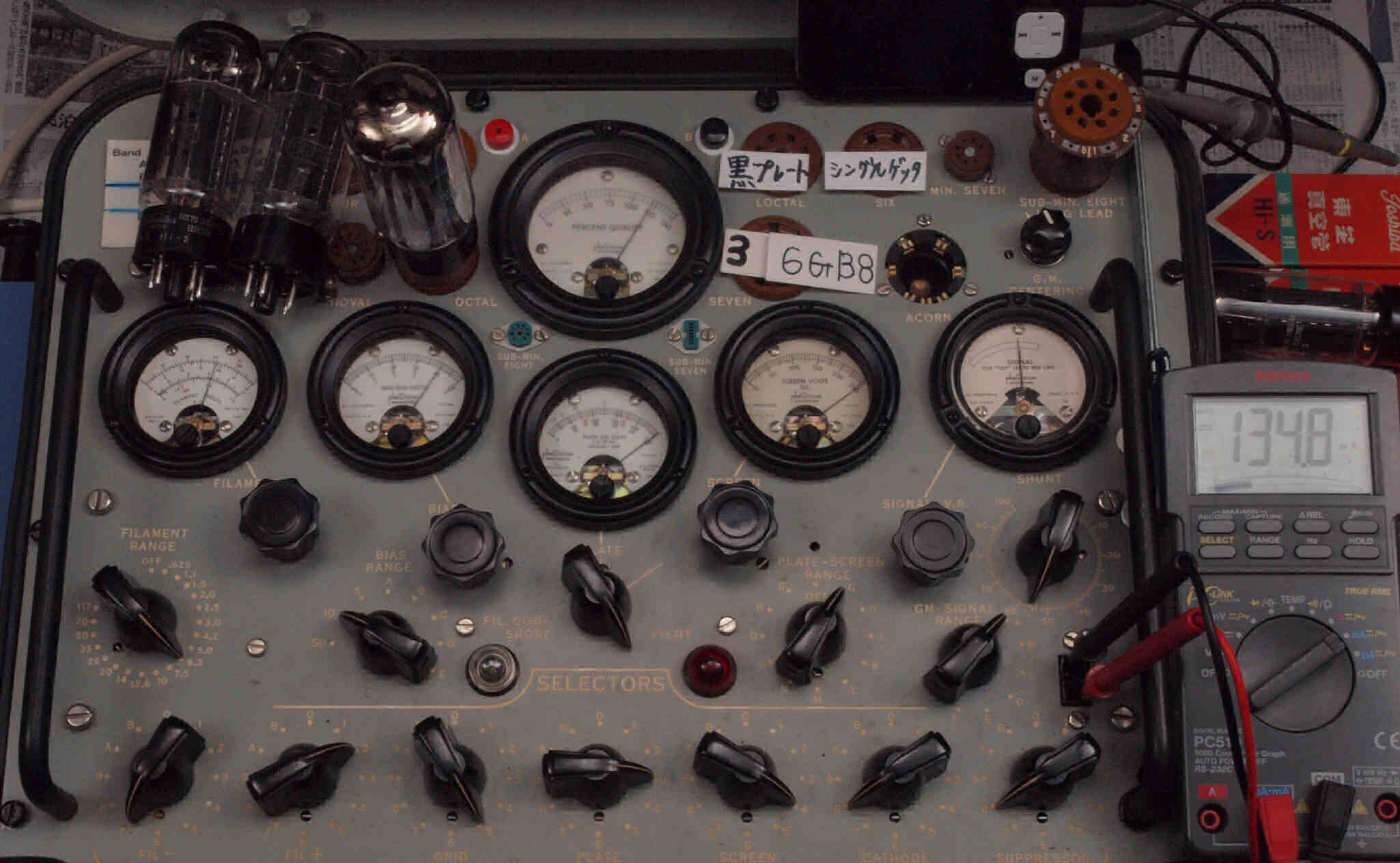 | 左から 1本目 6G-B8 測定。 Gm=20000μmho、Ip=97.6mA。 2本目 6G-B8 測定。 Gm=20000μmho、Ip=98.2mA。 3本目 6G-B8 測定。 Gm=21000μmho、Ip=102.7mA。 4本目 6G-B8 測定。 Gm=19000μmho、Ip=99.2mA。 |