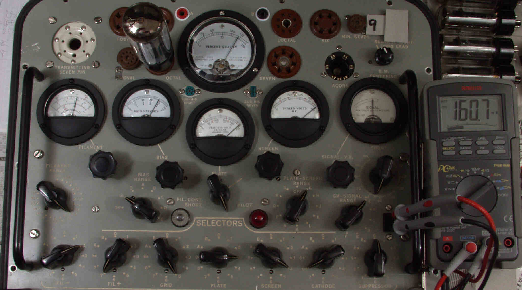 | M9. 9本目 6G-B8 測定。 Gm=24000μmho、Ip=160.7mA。RangeSW=A、FullScale=30000μmho。 測定条件、 「Ep=250V、Esg=250V、Eg1=−8V」 |