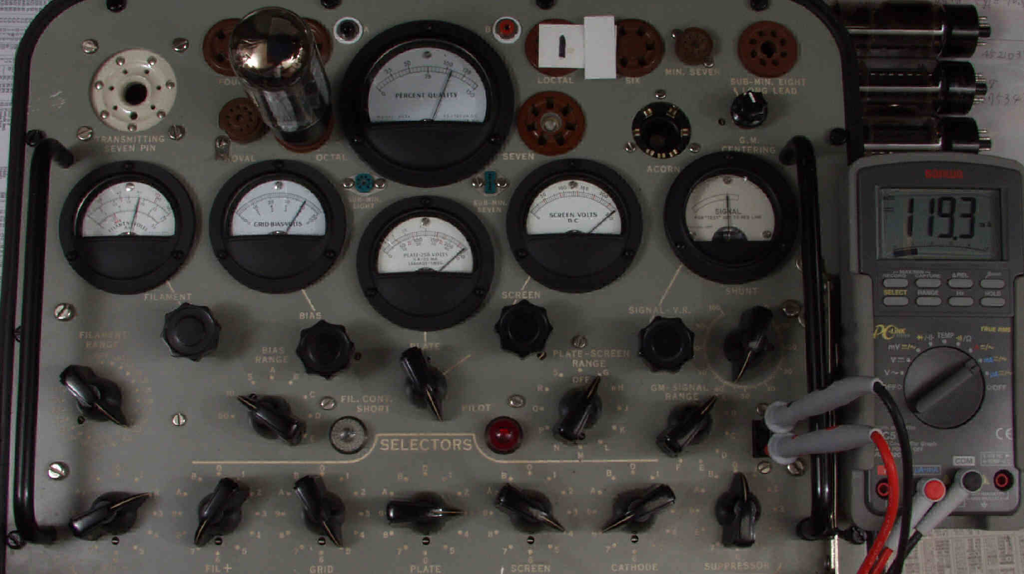 | K1. 1本目 6G-B8 測定。 Gm=20000μmho、Ip=115.1mA。RangeSW=A、FullScale=30000μmho。 測定条件、 「Ep=250V、Esg=250V、Eg1=−8V」 |