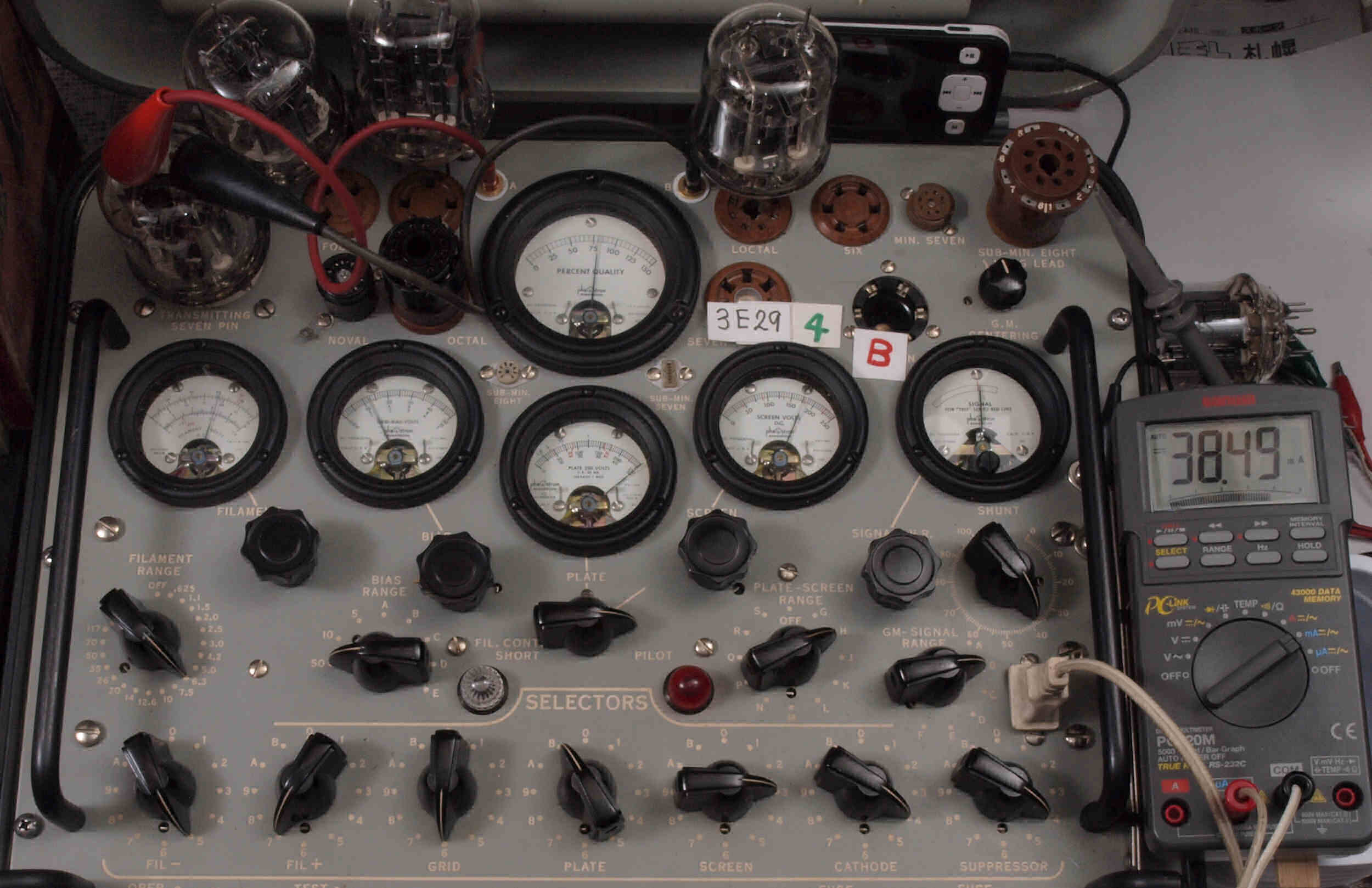 | A31. 3本目 3E29 ユニット1測定。 Gm=7700μmho、Ip=62.1mA。 測定条件、 「Ep=250V、Esg=175V、Eg1=−12V」RangeSW=C、FullScale=15000μmho。 |